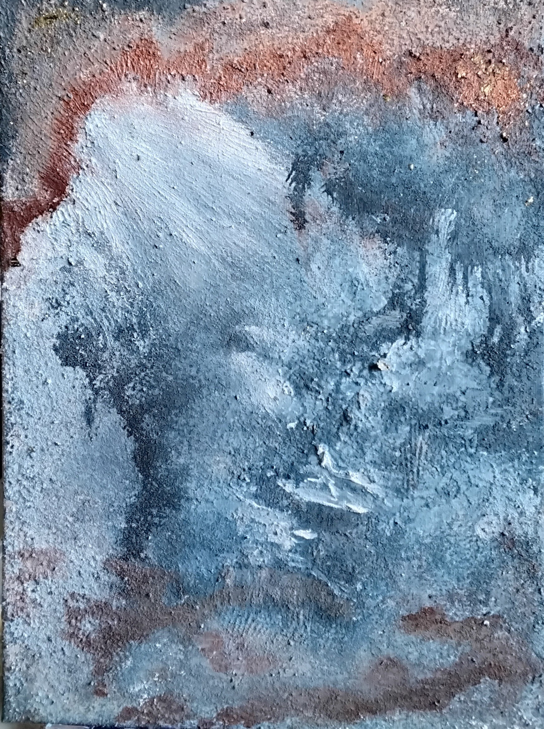 Wederom iets nieuws geprobeerd. Gesso met zand en nog nat geschilderd met acryl en kleuren en onderlaag gemêleerd met een fijn "harkje" structuur gecreëerd en pas na droging boven wat bladgoud toegevoegd