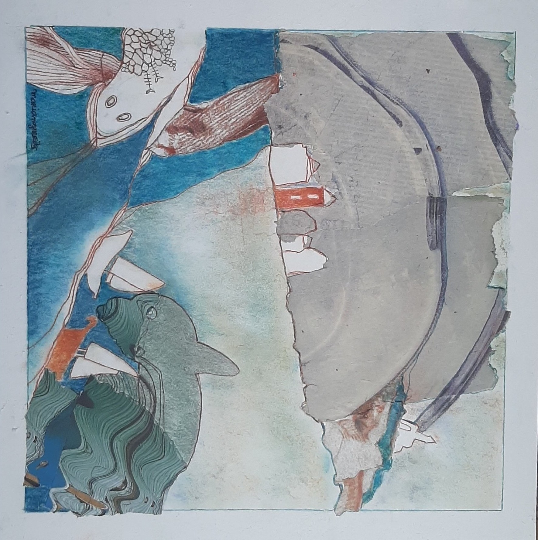 Het uitgangspunt van dit werk was een krantenfoto van een bevroren plas. Het leek een soort hemelgewelf of een kleurloze regenboog. Daar paste een dorpje onder en de rivier kwam vanzelf. Collagemateriaal en pastel op papier. Nr. 1 in de serie "Huisje, boompje, soms een beestje".