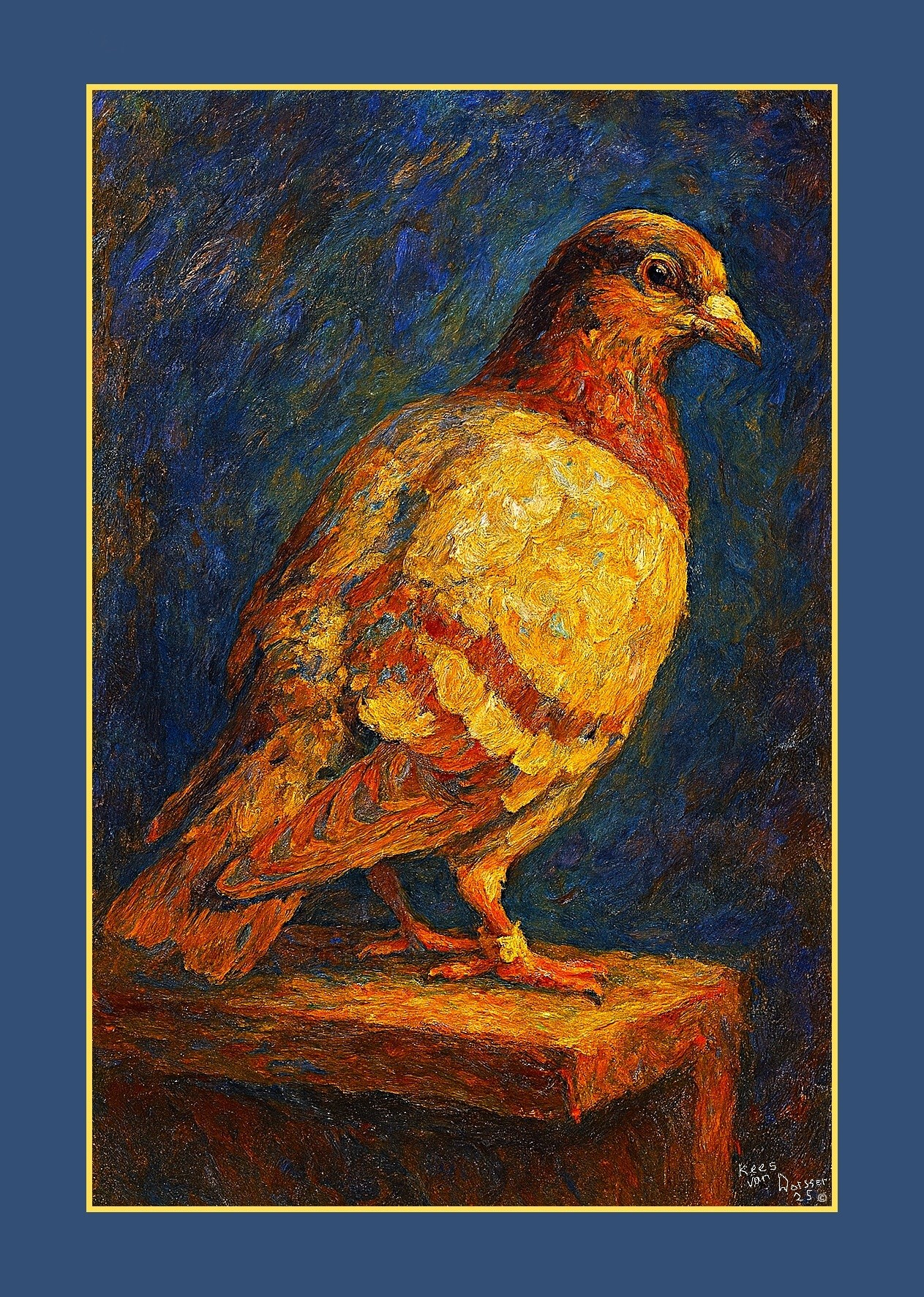 De duif rust op een houten rand, haar veren in warme tinten van bruin, oker en crème, alsof ze zonlicht draagt in haar borst. De achtergrond is een mengsel van diepblauw, paars en groen-een schemering van kleur waarin het dier zich aftekent als een herinnering aan vrede, waakzaamheid en eenvoud.