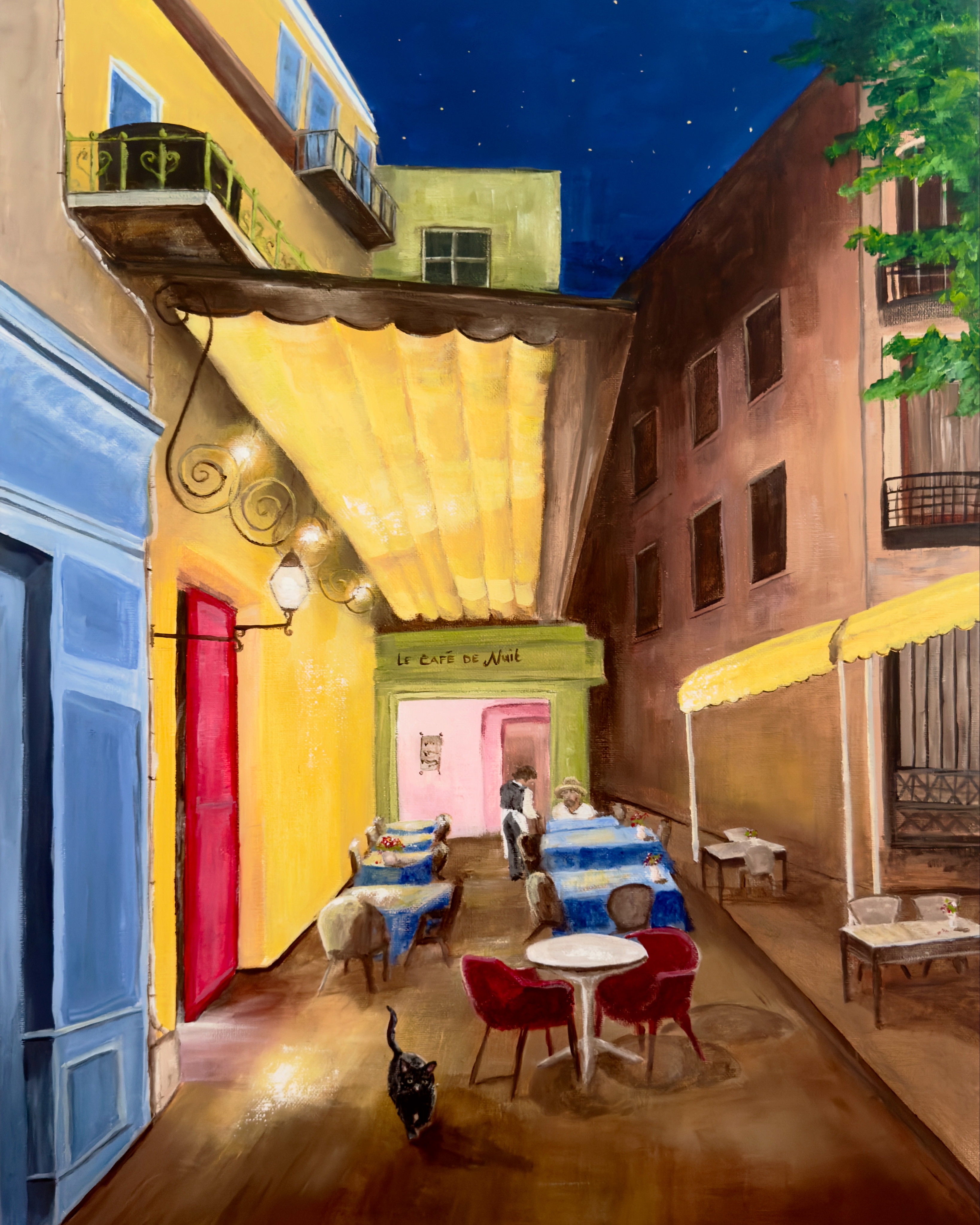Geïnspireerd door ons recente bezoek aan de Van Gogh Lumineers-expositie in Estepona, heb ik mijn eigen interpretatie gemaakt van zijn beroemde werk Le Café de Nuit. Uit nieuwsgierigheid zocht ik op of het café nog bestond – en inderdaad, het staat er nog steeds. Met een combinatie van verschillende referenties heb ik de juiste hoek gevangen en een nieuwe versie gecreëerd. Achterin verschijnt een ober én Van Gogh zelf, terwijl op de voorgrond de zwarte kat van zijn vriend Paul Gauguin langsloopt. Geschilderd door Marescha Dit schilderij bevindt zich in Spanje, omgeving Marbella. Woon je in de buurt en heb je interesse? Neem dan gerust contact op.