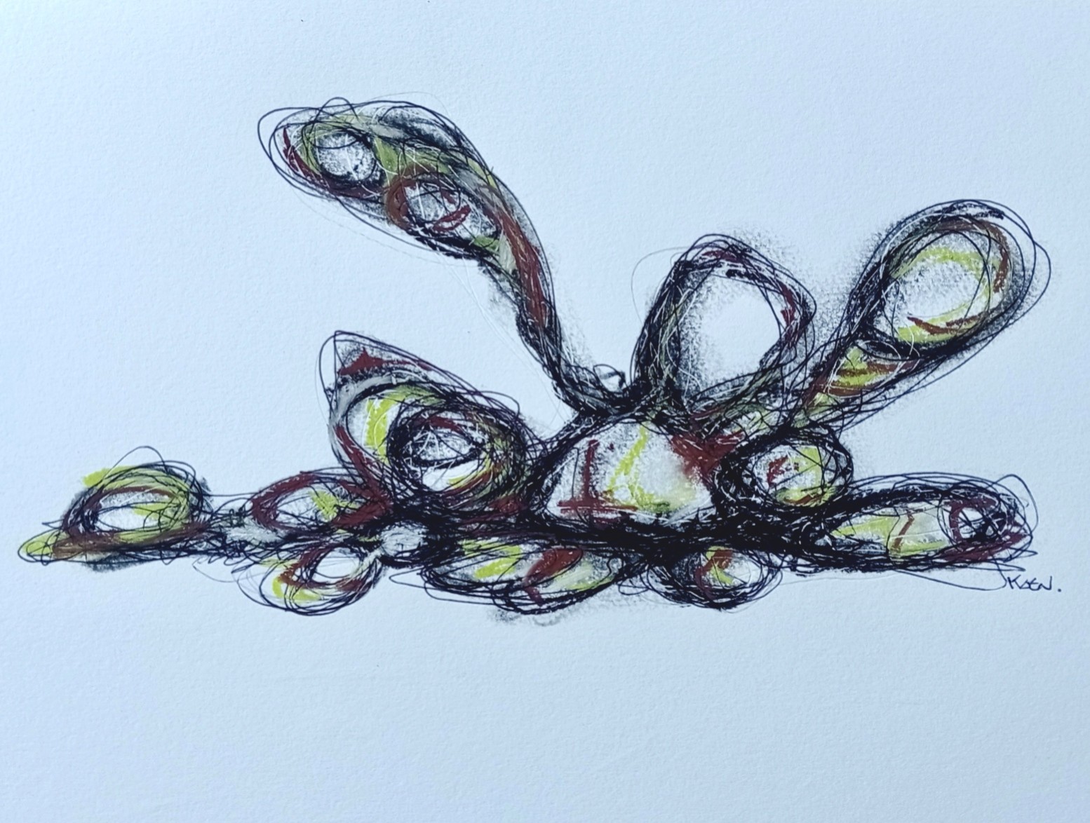 Een uitnodiging tot overgave. Ballpoint, houtskool en pastelkrijt.