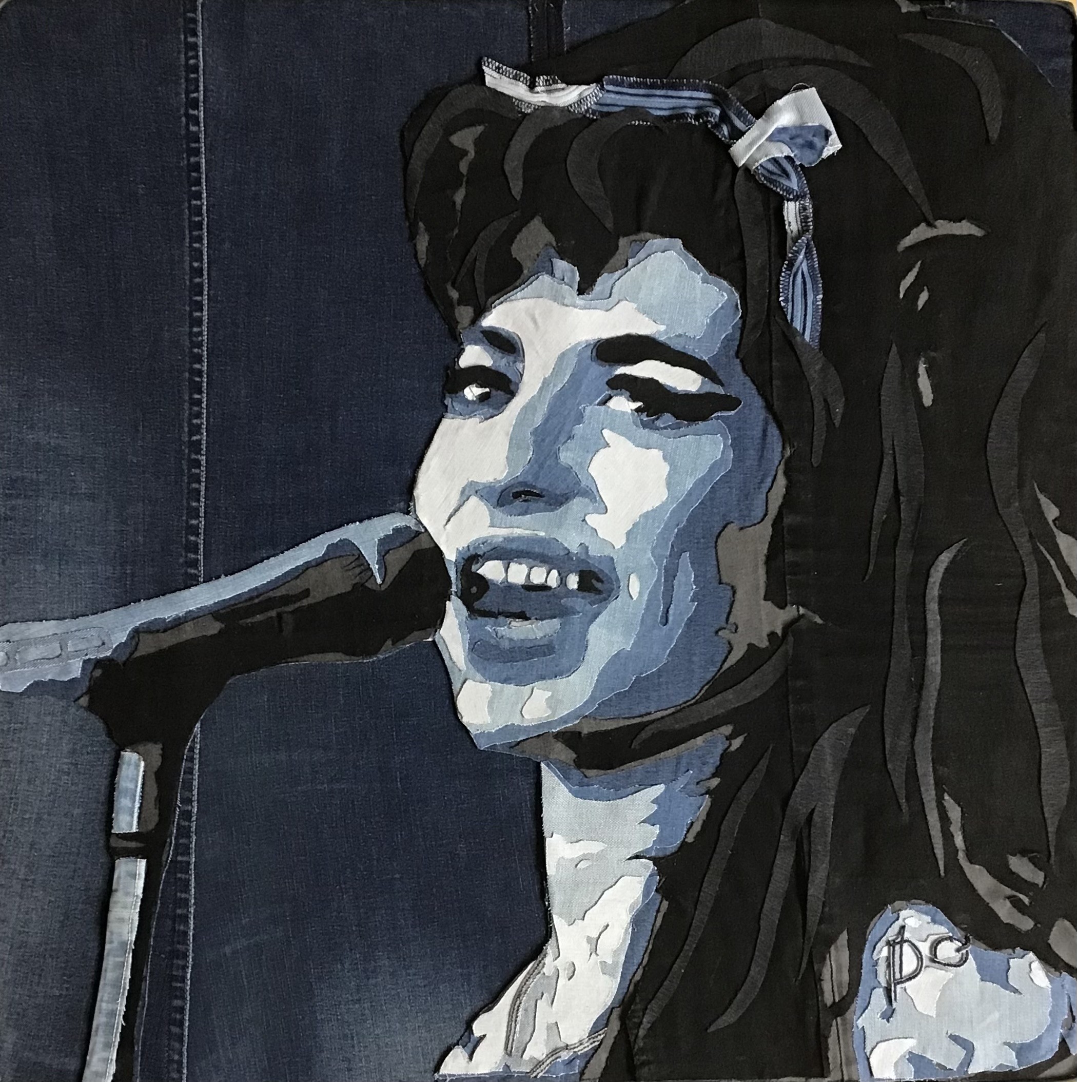 Ter nagedachtenis van deze Britse- jazz- en soulzangeres Emy Winehouse heb ik dit portret gemaakt met een foto als voorbeeld. Volledig gemaakt van gerecyclede jeans.