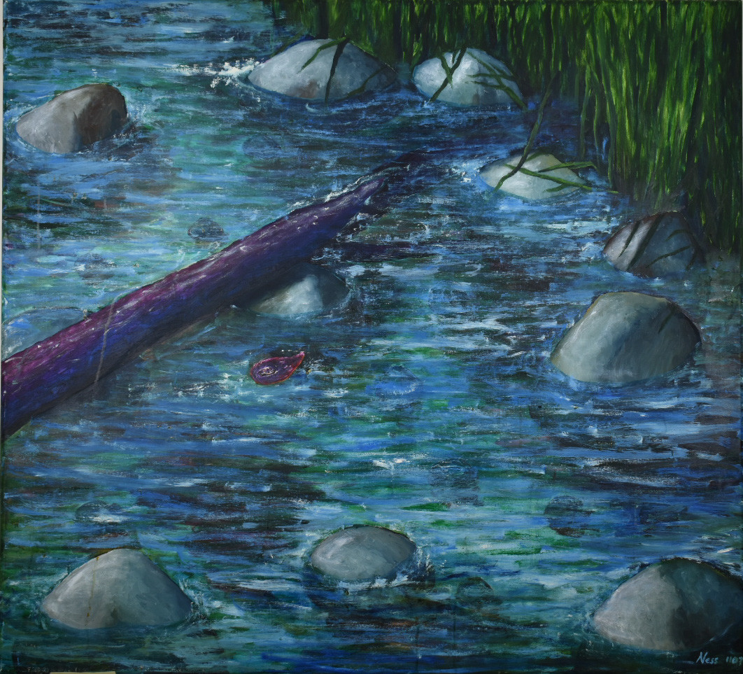 Een landschapschilderij van een stromende rivier met een eerste gevallen herfstblad