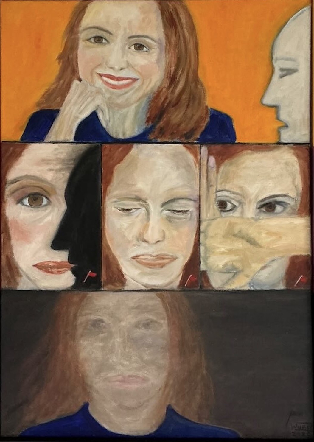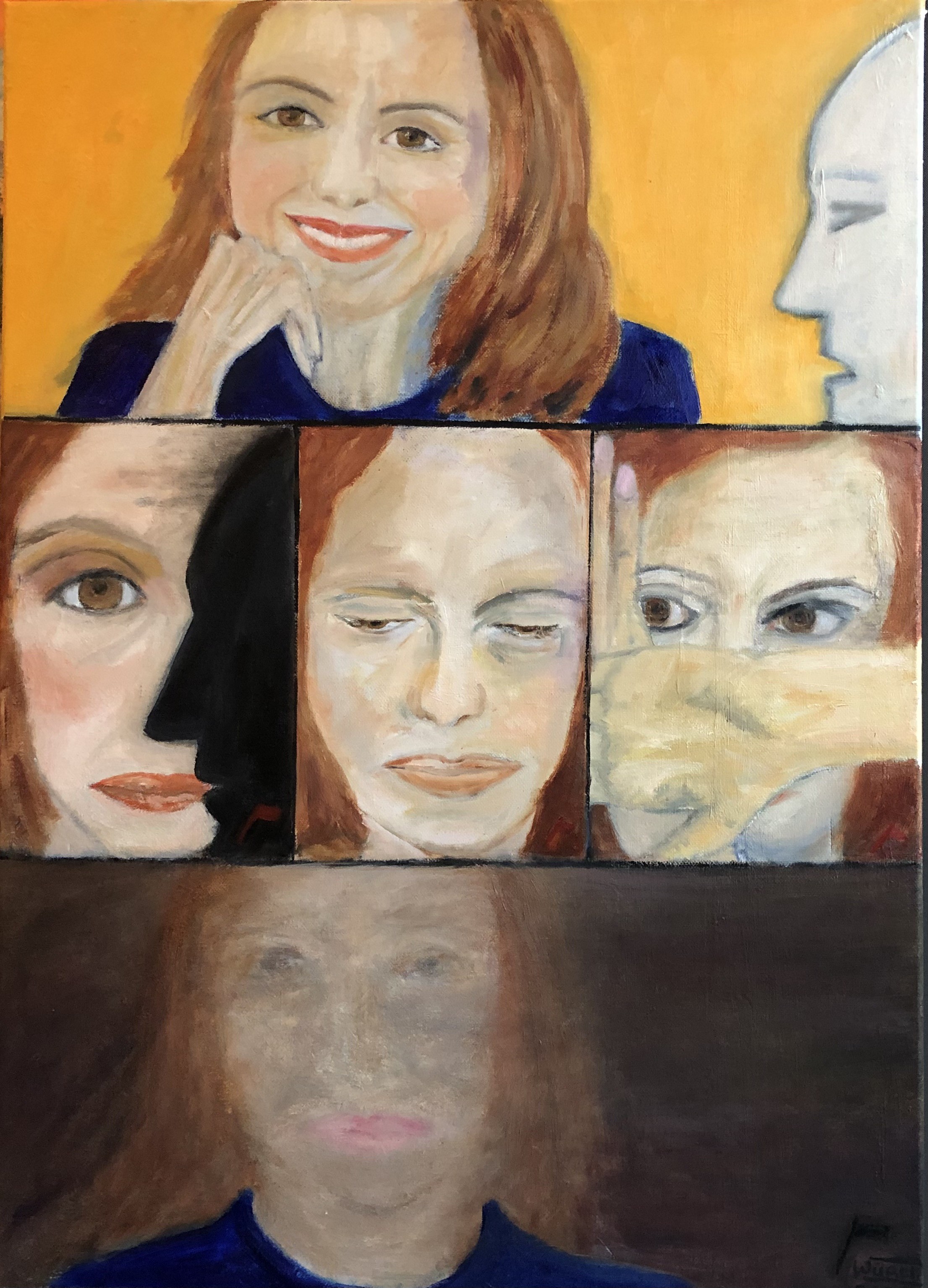 Dit schilderij toont femicide als een proces, vastgelegd binnen strakke kaders. Van boven naar beneden verliest een jonge vrouw zichtbaar haar autonomie, blik en aanwezigheid. Zwarte lijnen verdelen het beeld in vijf vlakken en begrenzen haar steeds verder. De middelste portretten tonen van links naar rechts de innerlijke verschuiving van twijfel naar angst. In het onderste vlak lost de vrouw op, terwijl haar kleding de kleur van haar begin behoudt. Zij verdwijnt; maar zij was hier. Femicide begint niet bij de dood, maar bij het wissen van iemands bestaan. Dit werk laat dat proces zien. Verdere toelichting Het schilderij toont de geleidelijke ontmenselijking van een jonge vrouw binnen een gewelddadige relatie, eindigend in femicide. In het eerste portret is ze zelfbewust, levendig en aanwezig. De achtergrond versterkt dit gevoel van energie en openheid. Aan de rand verschijnt slechts vaag de contour van een mannengezicht; geen directe dreiging maar al wel aanwezig. In het tweede portret verandert haar blik. Twijfel en onzekerheid nemen de plaats in van zelfvertrouwen. De mannelijke contour bedekt nu een deel van haar gezicht. Dit beeld verbeeldt hoe controle en manipulatie zich een weg banen in haar denken: hij kruipt in haar hoofd. Het derde portret toont de gevolgen hiervan. De vrouw verliest zichtbaar haar innerlijke kracht. Waar zij eerst keek, ondergaat zij nu. In het vierde portret heeft angst het volledig overgenomen. De dreiging is niet langer abstract maar lichamelijk en emotioneel voelbaar. In het laatste beeld is de vrouw niet langer aanwezig als persoon; haar blik is leeg. Dit portret staat voor femicide: het definitieve verdwijnen van een leven dat ooit vol kleur en eigenheid was.