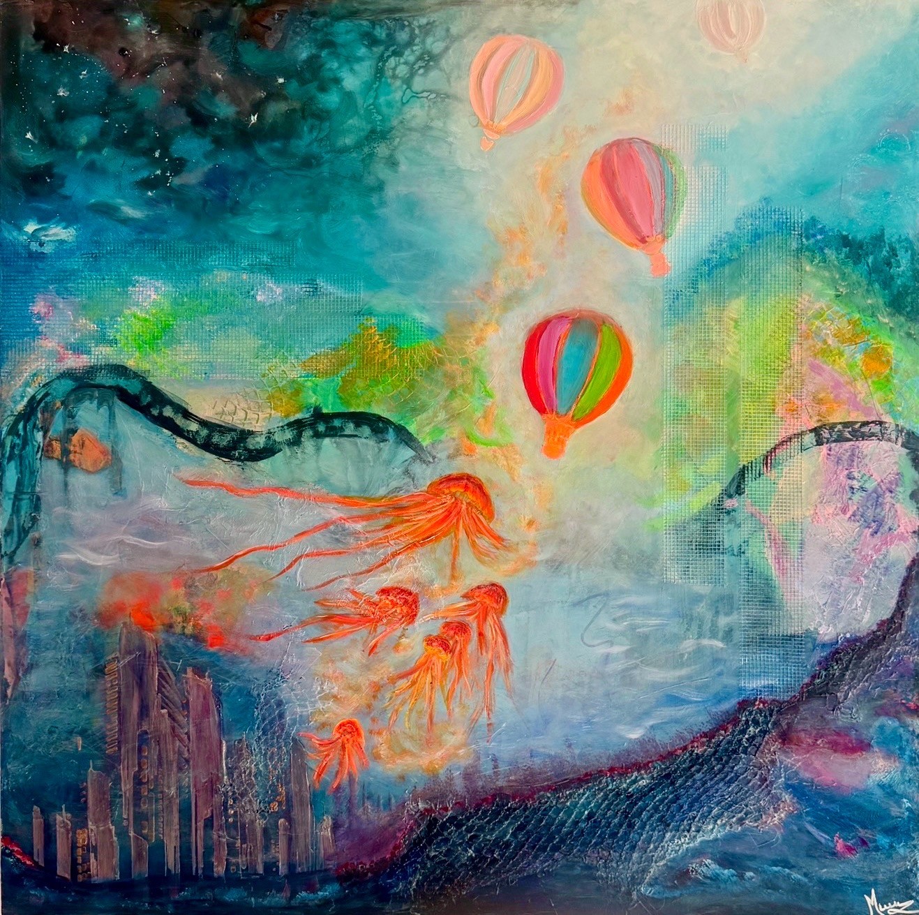 De titel kan op 2 manieren worden uitgelegd. Er is een opwaartse beweging van vliegen door water en lucht, en er is transformatie, op weg naar het licht. Of vluchten ze, uit de turbulentie van die onderwaterwereld, door de opening op weg naar iets anders? Mixed media en olieverf.