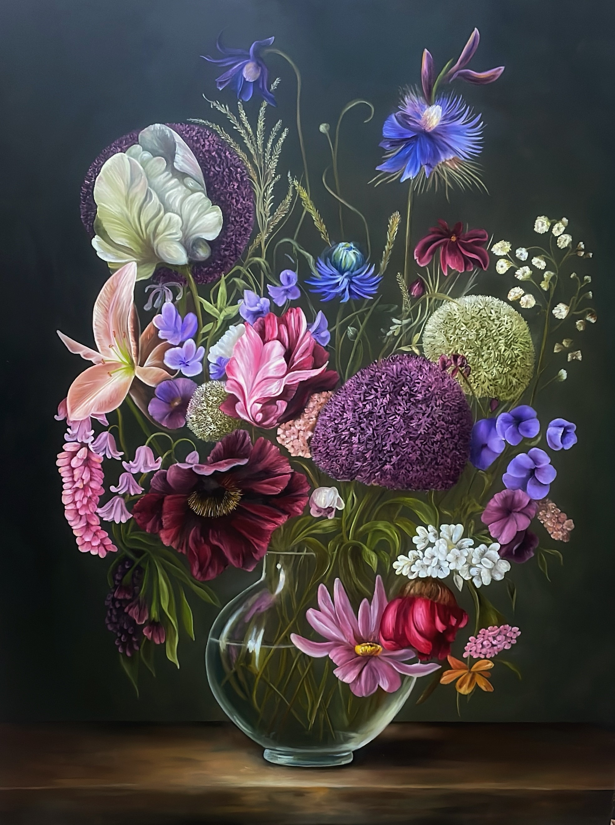 ‘Floral Euphoria’ toont een weelderig boeket van uiteenlopende bloemen, waaronder tulpen, papaver en sierlijke allium, gerangschikt in een glazen vaas. Door de diversiteit aan vormen en kleuren krijgt het werk een levendige, bijna exuberante uitstraling, terwijl de compositie zorgvuldig in balans blijft. Voor dit schilderij heb ik mij laten inspireren door de stijl van de 17e-eeuwse Nederlandse meesters, vertaald naar een hedendaagse beeldtaal waarin opvallend kleurgebruik en dramatiek centraal staan. Tegen een donkere achtergrond worden de bloemen belicht door een gerichte lichtbron, waardoor zij plastisch naar voren treden en een sterke ruimtelijkheid ontstaat. Het spel van licht en schaduw, het clair-obscur, versterkt de intensiteit van de kleuren en verleent het werk een ingetogen dramatiek. De transparante glazen vaas voegt een extra laag van complexiteit toe: reflecties, lichtbrekingen en subtiele nuances in de lichtval heb ik met grote aandacht uitgewerkt. Door een gelaagde schilderopbouw ontstaat een bijna tastbare materialiteit van zowel glas als bloem. Voor mij verwijst ‘Floral Euphoria’ naar een periode waarin bloemstillevens niet alleen esthetisch werden gewaardeerd, maar ook symbolische betekenissen droegen. Zij weerspiegelden welvaart, kennis van de natuur en tegelijkertijd de vergankelijkheid van schoonheid. In dit werk heb ik getracht die traditie voort te zetten, met een eigentijdse gevoeligheid voor kleur en compositie.