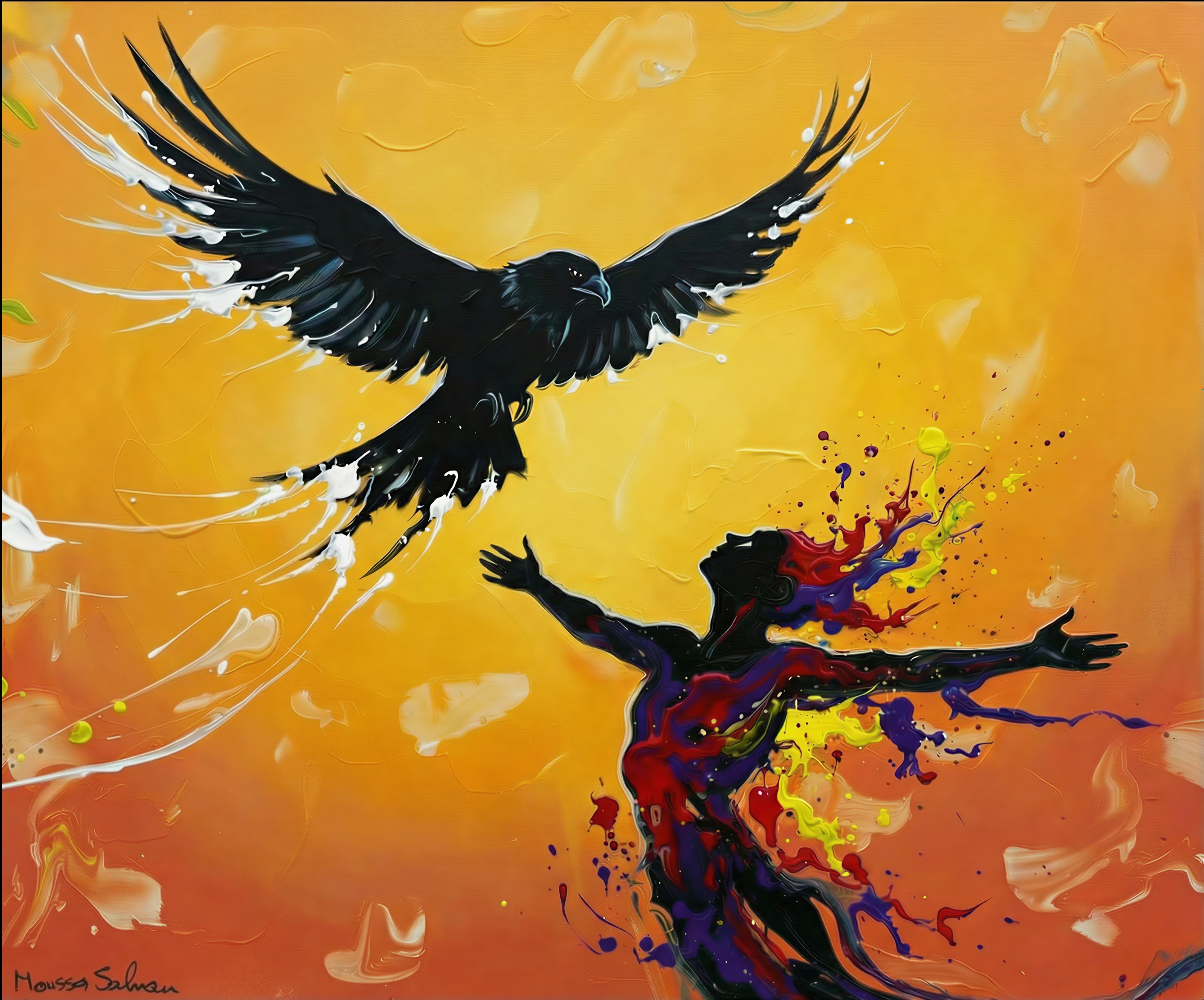 Fly with Me is an invitation to shared, joyful freedom, a conversation between the human soul and the wild spirit of nature. The title itself serves as a promise to rise above the everyday. The central figure stands with arms wide open, actively welcoming a partner in flight. An explosion of bright color bursting from the dark form represents the joy and creativity that powers this ascent. Above, a great black bird answers the call. More than just a symbol, it acts as a guide and companion, with energetic white strokes connecting the two in a deep dance of unity. Set against a warm, golden orange sky representing hope and endless possibility, the painting’s thick, textured application pulls the viewer into the raw energy of the moment. It is a visual capture of the specific instant the soul accepts the call to fly.