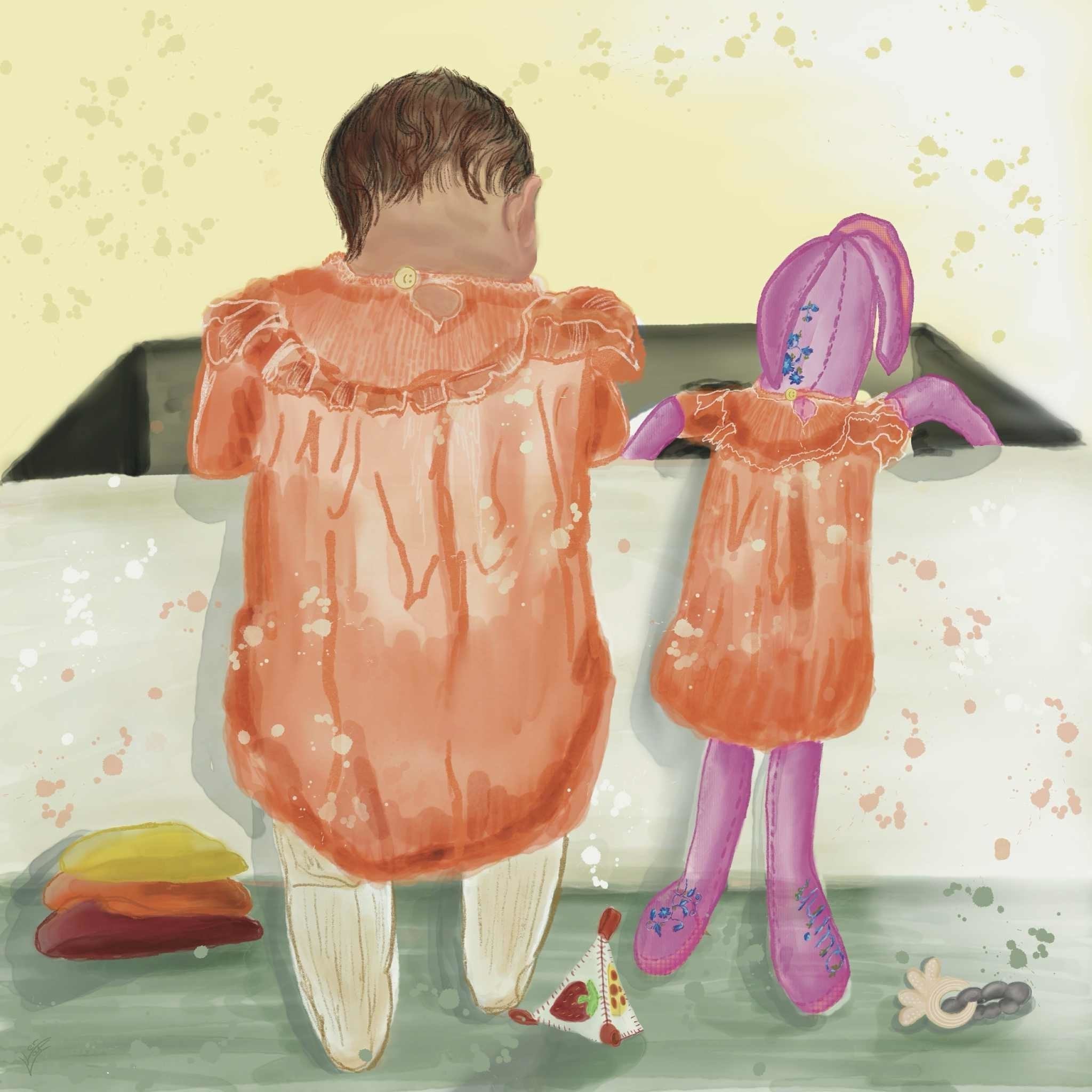 Digitale tekening in watercolors, samen speelgoed uitzoeken in de speelgoedkist.