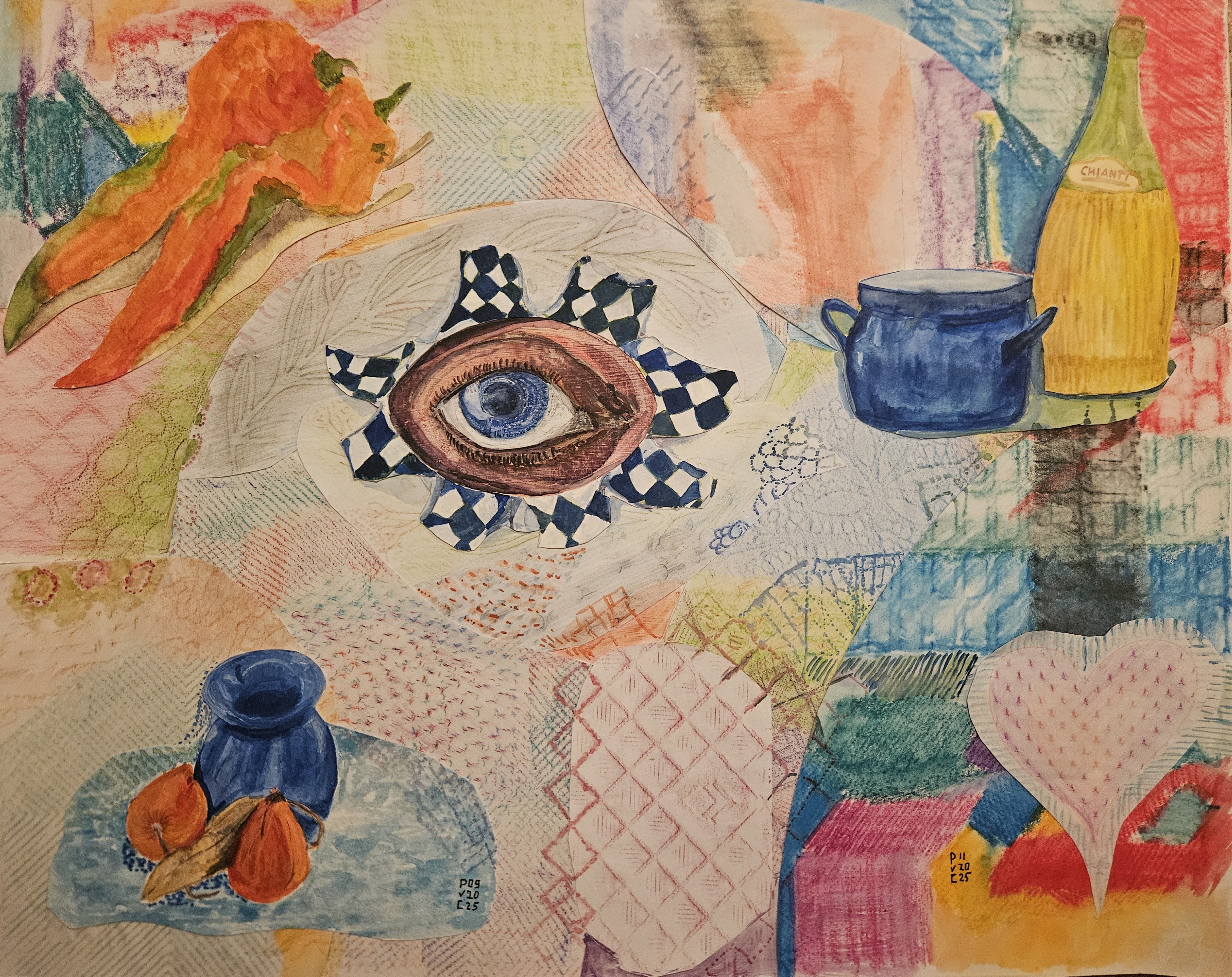 Een woord wat me werd uitgelegd als techniek om te gebruiken bij een collage, met dit resultaat. Dit met potlood en aquarel gemaakt.