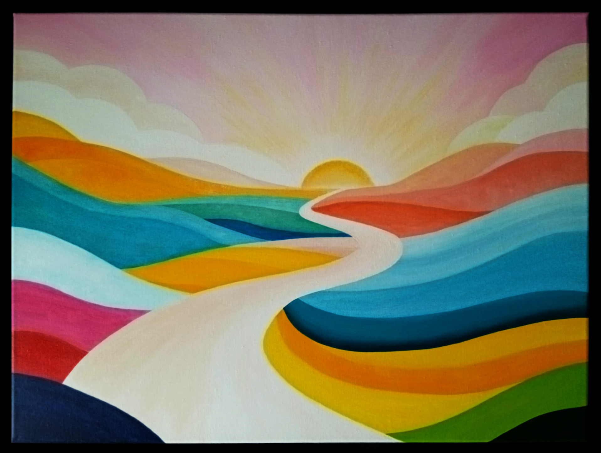 Een landschap bestaande uit abstracte, kleurrijke vlakke, dat een gevoel van rust, maar ook positiviteit uitstraalt.