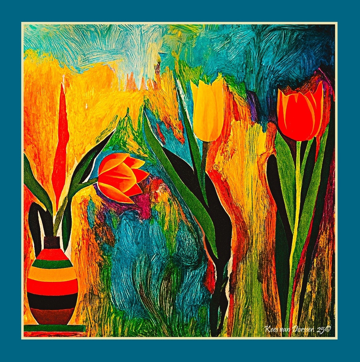 In een vaas van strepen staan tulpen rechtop - rood, geel, oranje, als herinneringen die zich niet laten plukken. De achtergrond zindert van leven: penseelsteken als gedachten. Dit werk is een ode aan het moment vóór het vergeten, waarin alles nog klopt - de kleur, de geur, de vorm.