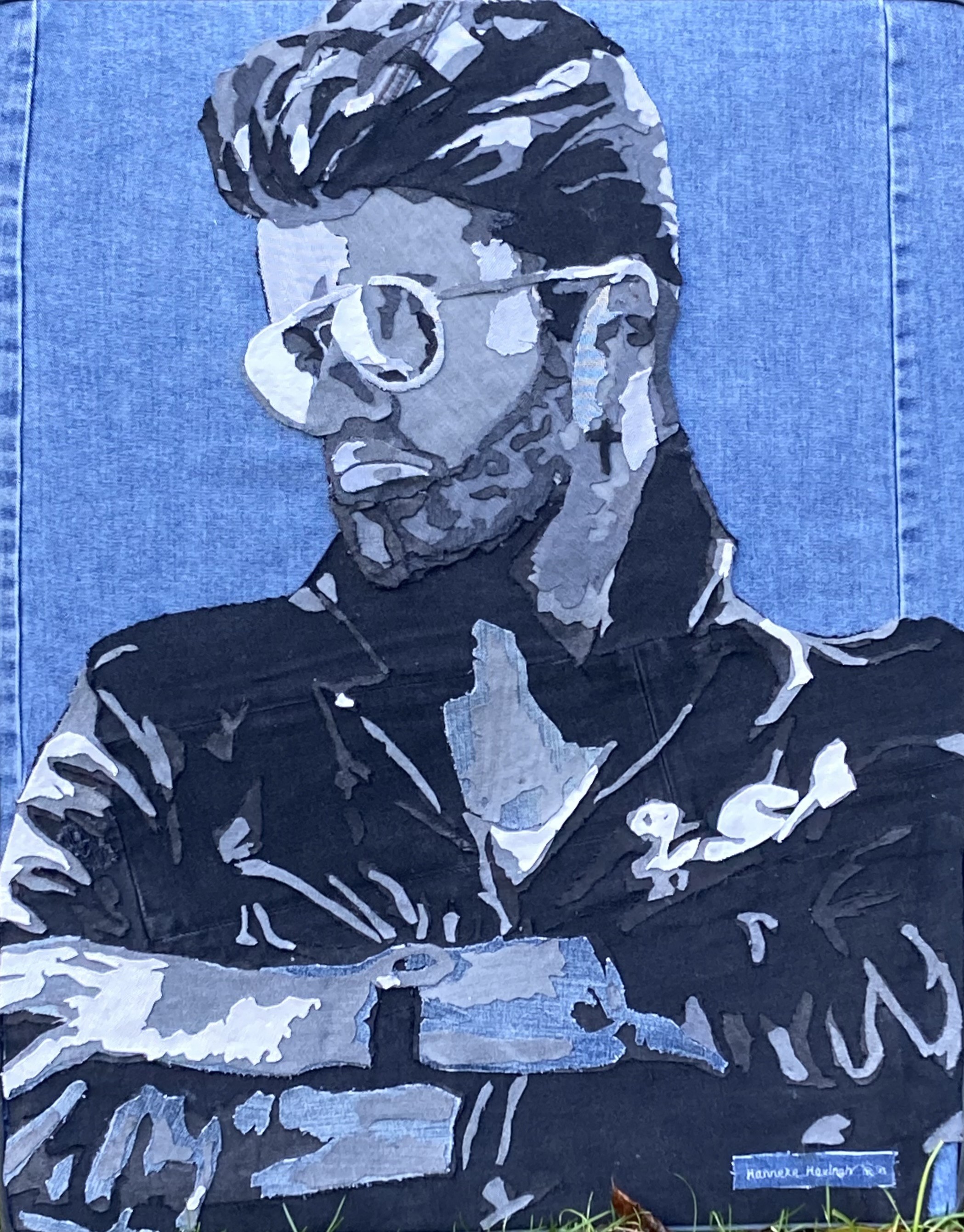 Dit portret heb ik in opdracht gemaakt voor een groot fan van George Michael en hiervoor werd mij een foto toegestuurd van George. Het portret is van gerecyclede jeans gemaakt en hiervoor zijn 7 spijkerbroeken verknipt.