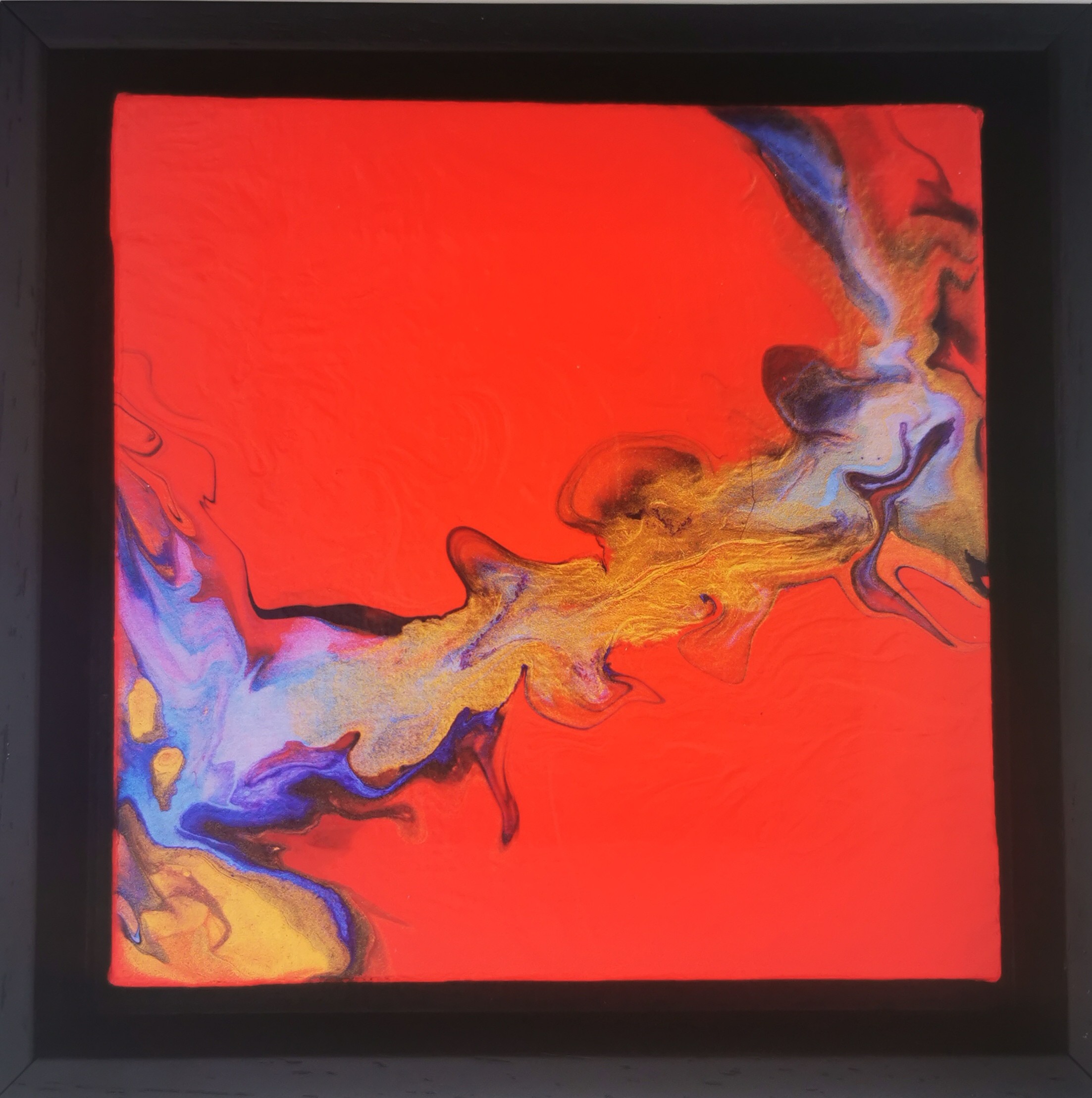 Dit is een mini schilderij op canvas ingelijst in een zwarte baklijst in de techniel pouring paint.
