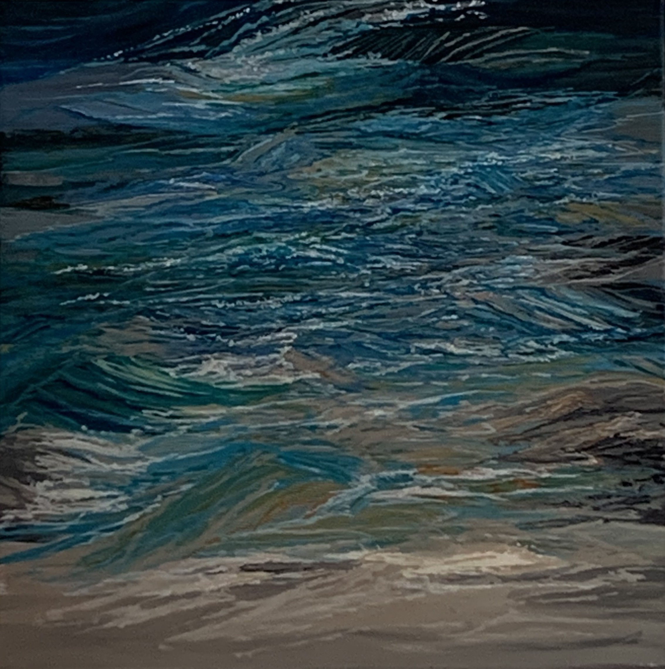In het abstracte schilderij ‘Golfslag’ breken en slaan de samengekomen golven om. Met de kleuren en de korte/lange lijnen geeft Carina vorm aan de energie van een golf die zand meevoert. Ook maakt Carina de deining van het water zichtbaar met de kleurspeling om vast te leggen dat de golven tot in het oneindige in beweging zijn.
