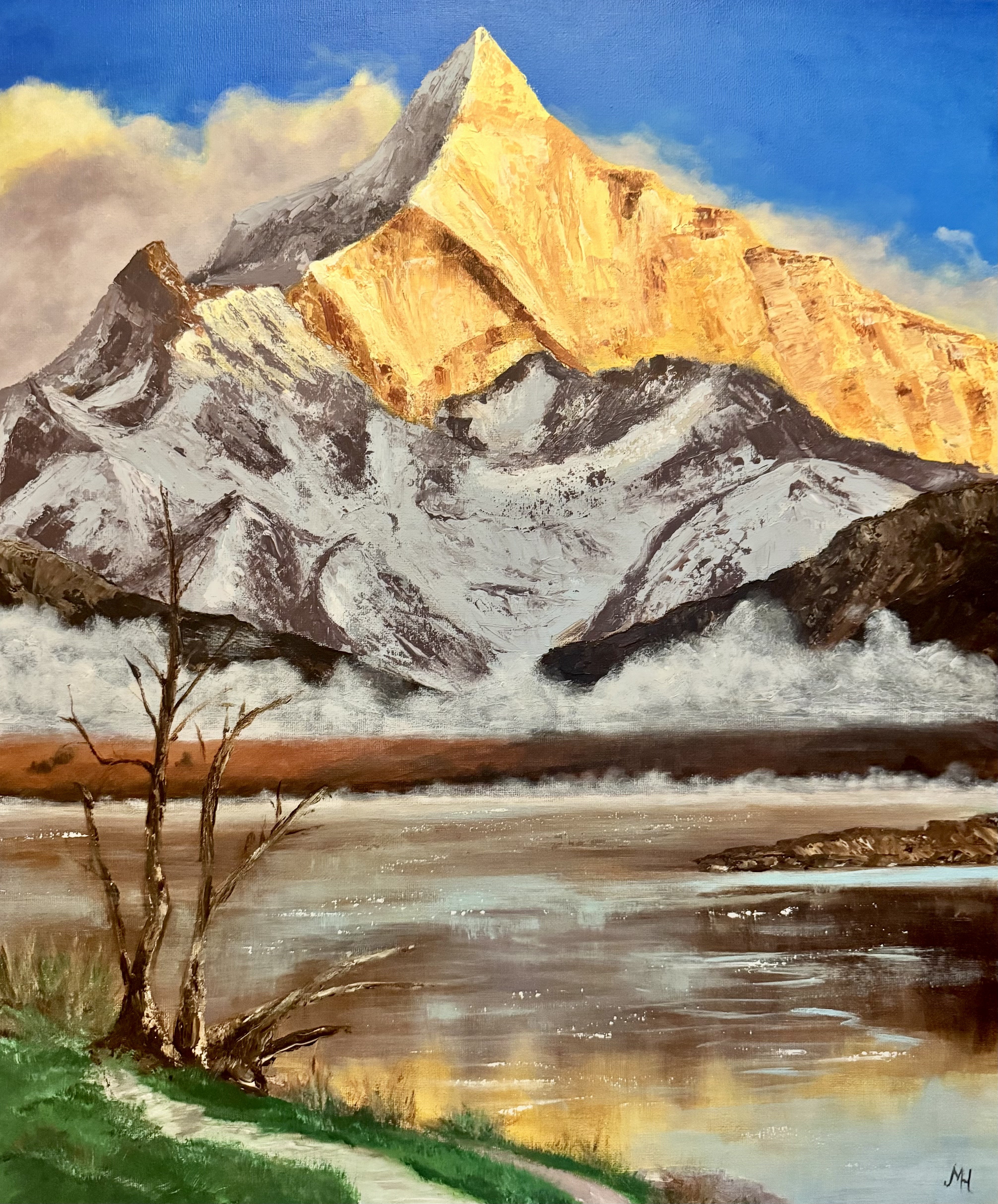 Een majestueus berglandschap gevangen in het gouden licht van de opkomende zon. De warme gloed op de bergtop contrasteert met de koele tinten van sneeuw en water, terwijl de nevel langzaam optrekt boven het meer. Een moment van stilte en verwondering, waarin natuur en licht samensmelten. Geschilderd door Marescha Dit schilderij bevindt zich in Spanje, omgeving Marbella. Woon je in de buurt en heb je interesse? Neem dan gerust contact op.