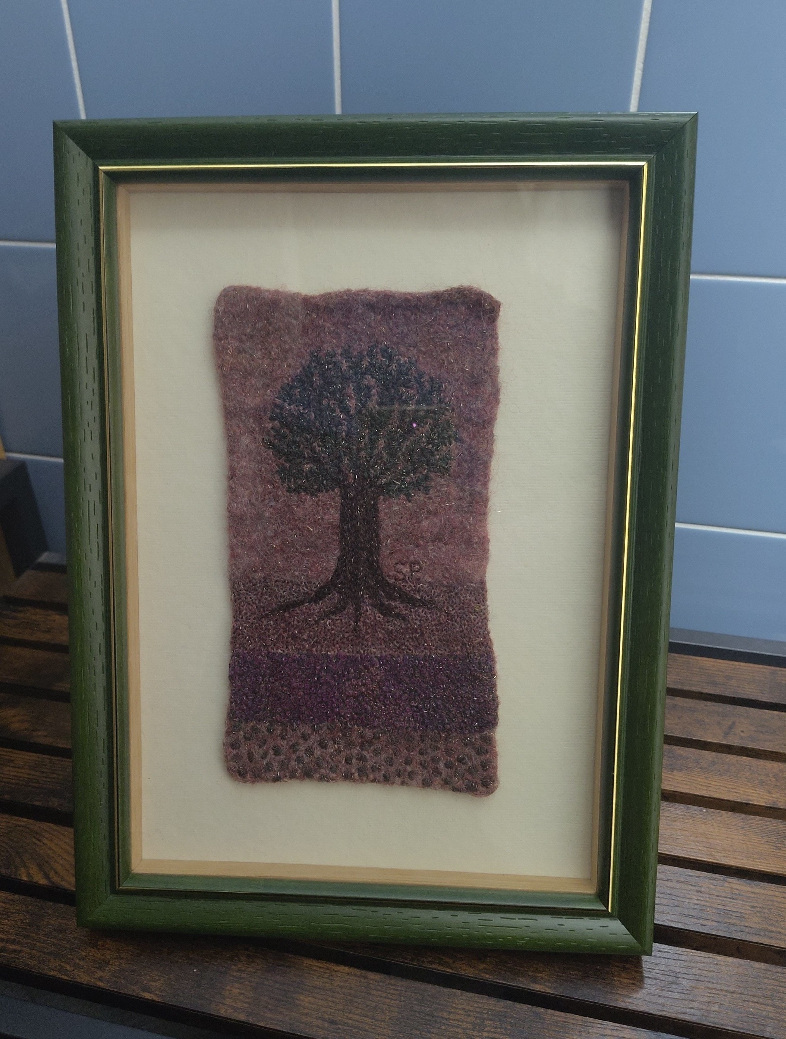 Dit werk laat een boom zien, waarvan het duidelijk is dat deze stevig in de aarde staat geplant. Dankzij zijn stevige wortels kan de boom groeien, en in het groeien verankert hij zich steeds steviger. Handgesponnen borduurgaren met op handgesponnen, handgebreide en vervilte stof, ingelijst achter acrylglas. De draden en de stof zijn een mix van wol en synthetische glittervezels. In werkelijkheid is het werk een fractie lichter, de diepe lijst en aanwezige glitters maken dit werk moeilijk te fotograferen. De opgegeven maten zijn inclusief lijst, het borduurwerk zelf is 21x11 cm. In private collectie
