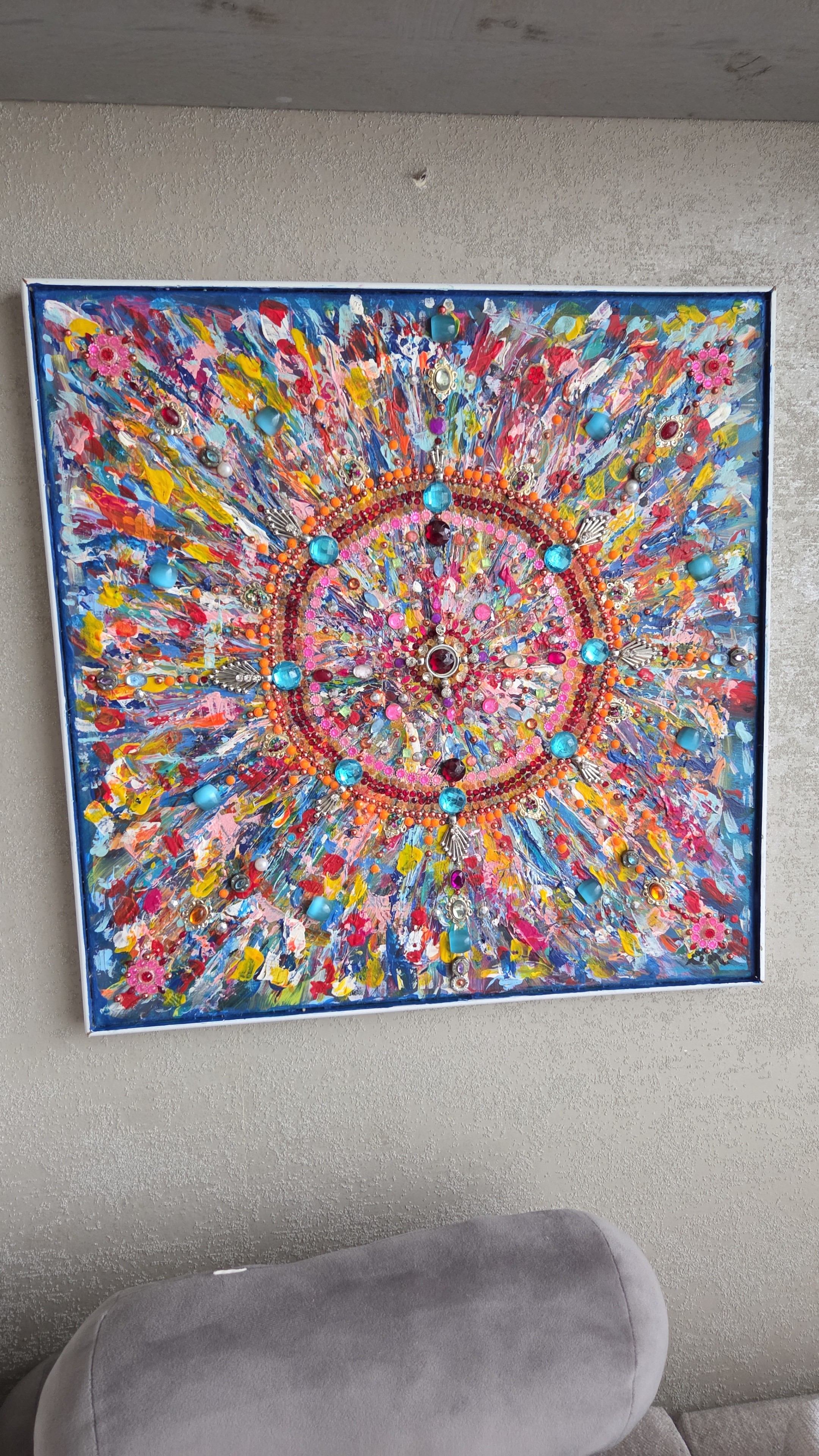 Schilderij met sierstenen die bij verschillende belichtingen positiviteit uitstralen