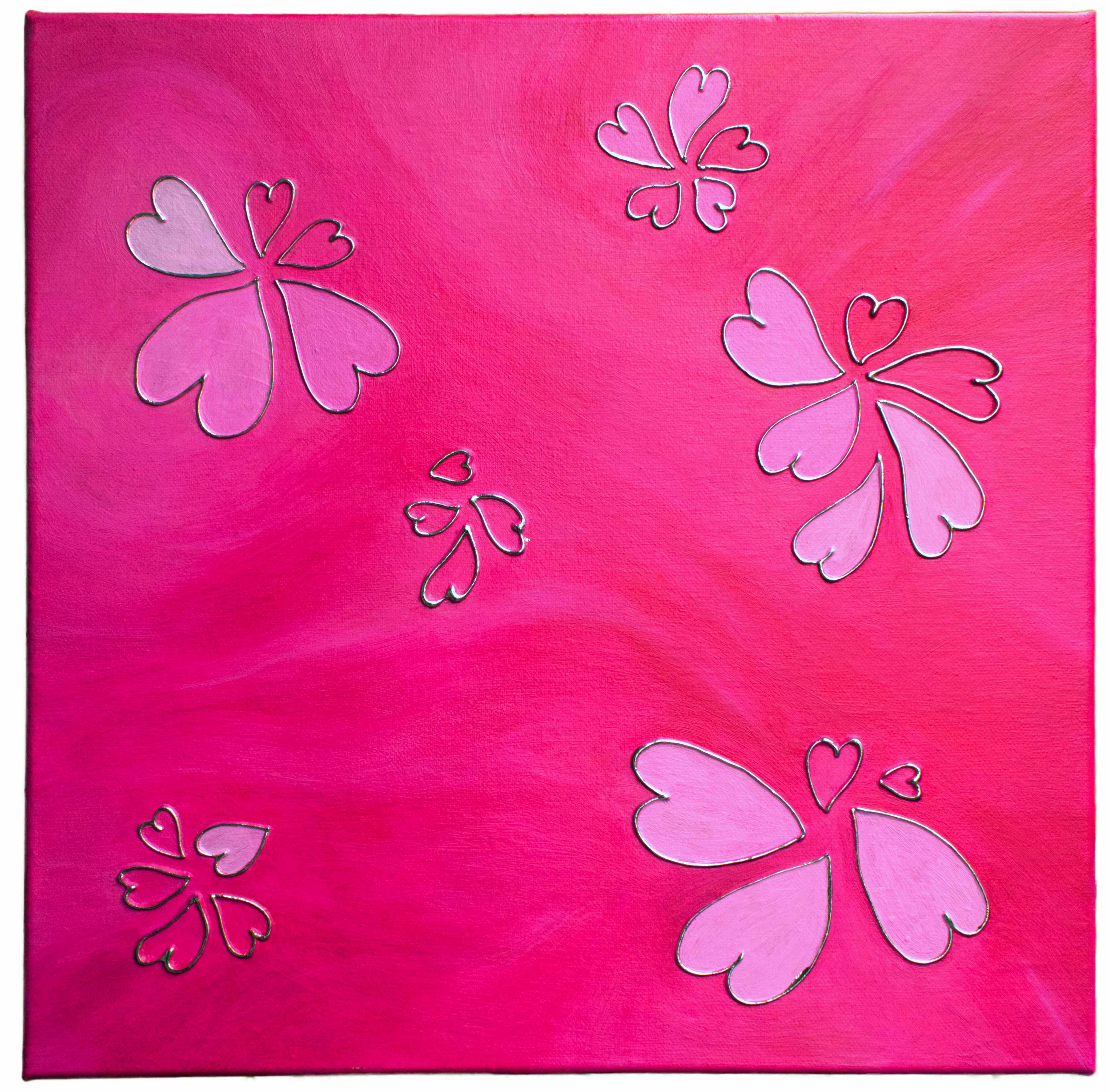 Het kunstwerk toont een levendige compositie met een warme, roze achtergrond waarin subtiele kleurovergangen te zien zijn. Over het oppervlak zijn hartjes te zien, die in groepjes bij elkaar horen. Deze hartjes lijken te dansen en zijn omlijnd met een dunne, glanzende zilverkleurige lijn, wat ze een elegant en luchtig karakter geeft. De combinatie van de roze tinten met de glimmende contouren zorgt voor een vrolijke, liefdevolle sfeer.