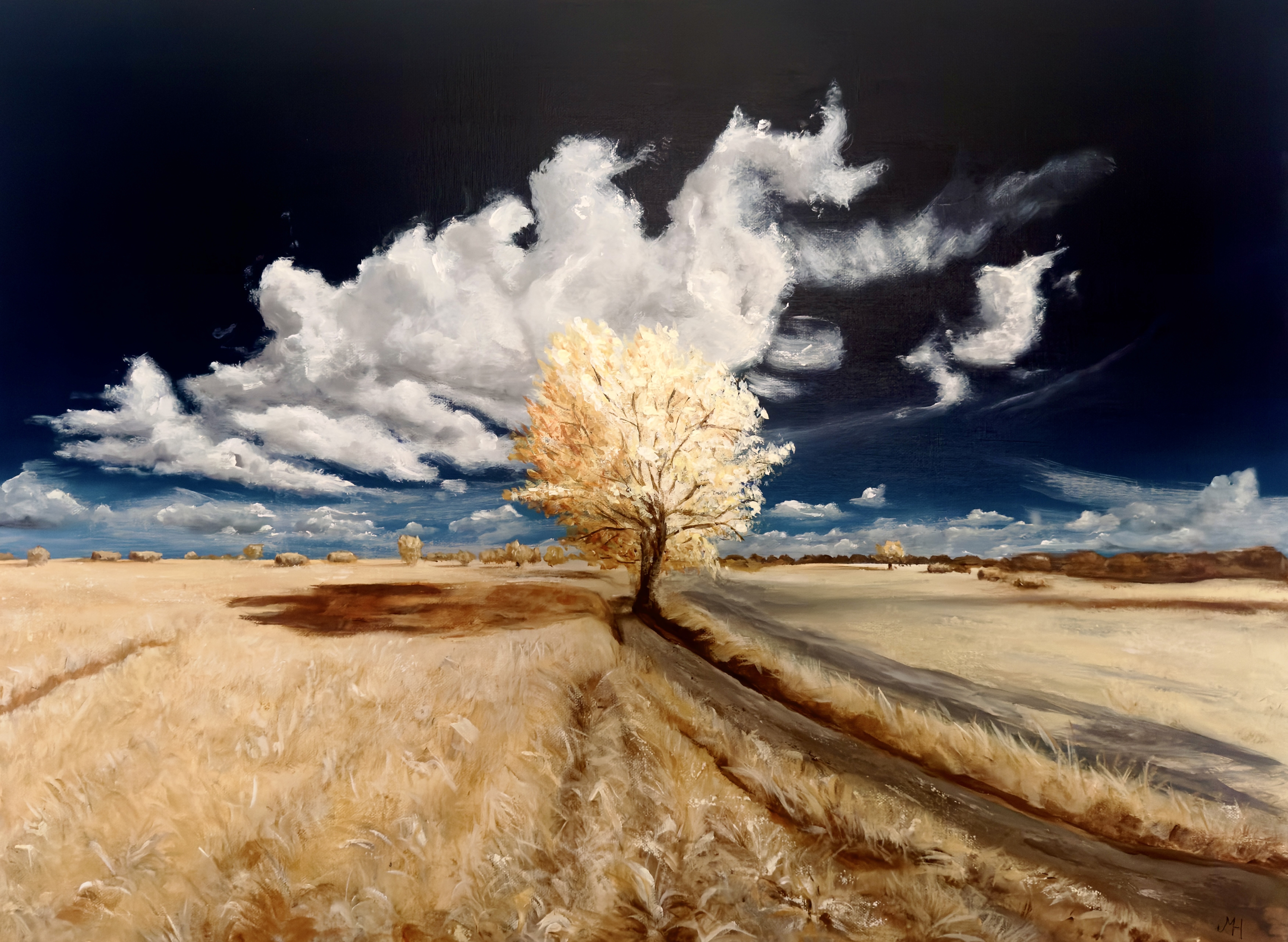 Een korenveld na de oogst. De rust die daarna komt. De gele boom vangt nog even het licht, terwijl de lucht al iets anders laat zien. Dat contrast vind ik mooi. Rust en spanning naast elkaar. Geschilderd door Marescha