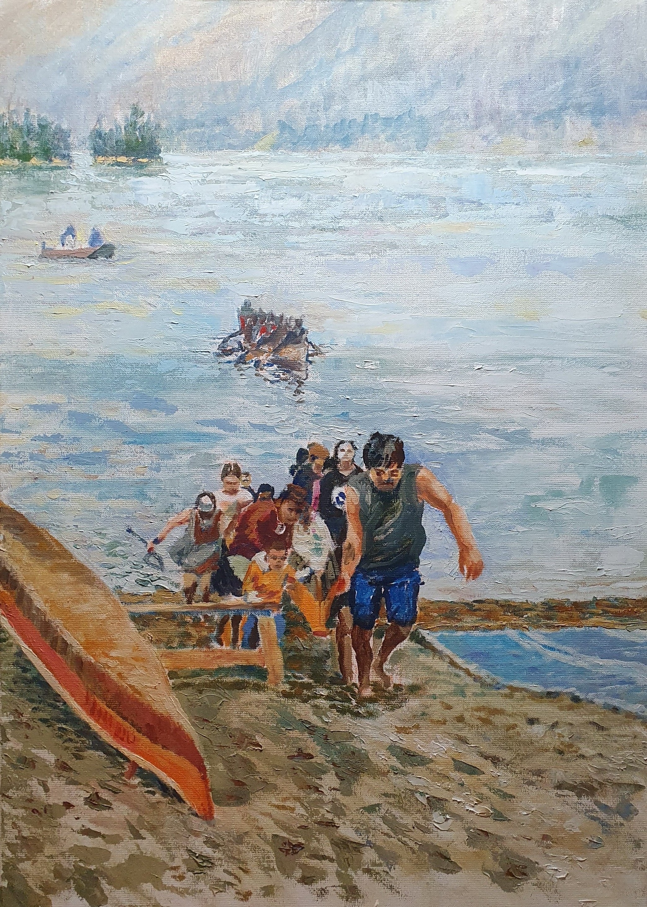 Groep Canadese roeiers na een wedstrijd op het meer, helpen elkaar en hun kano aan de kant.
