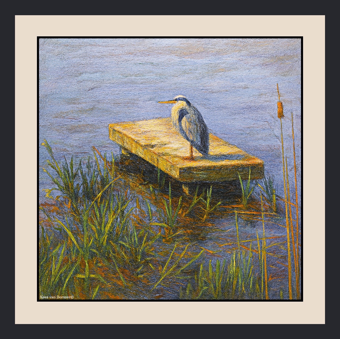 The sky is not above, but beneath, where water holds time in a wordless rhythm. The heron finds not flight, between water and water. The wooden platform is not an island, but a passage between light and reed.