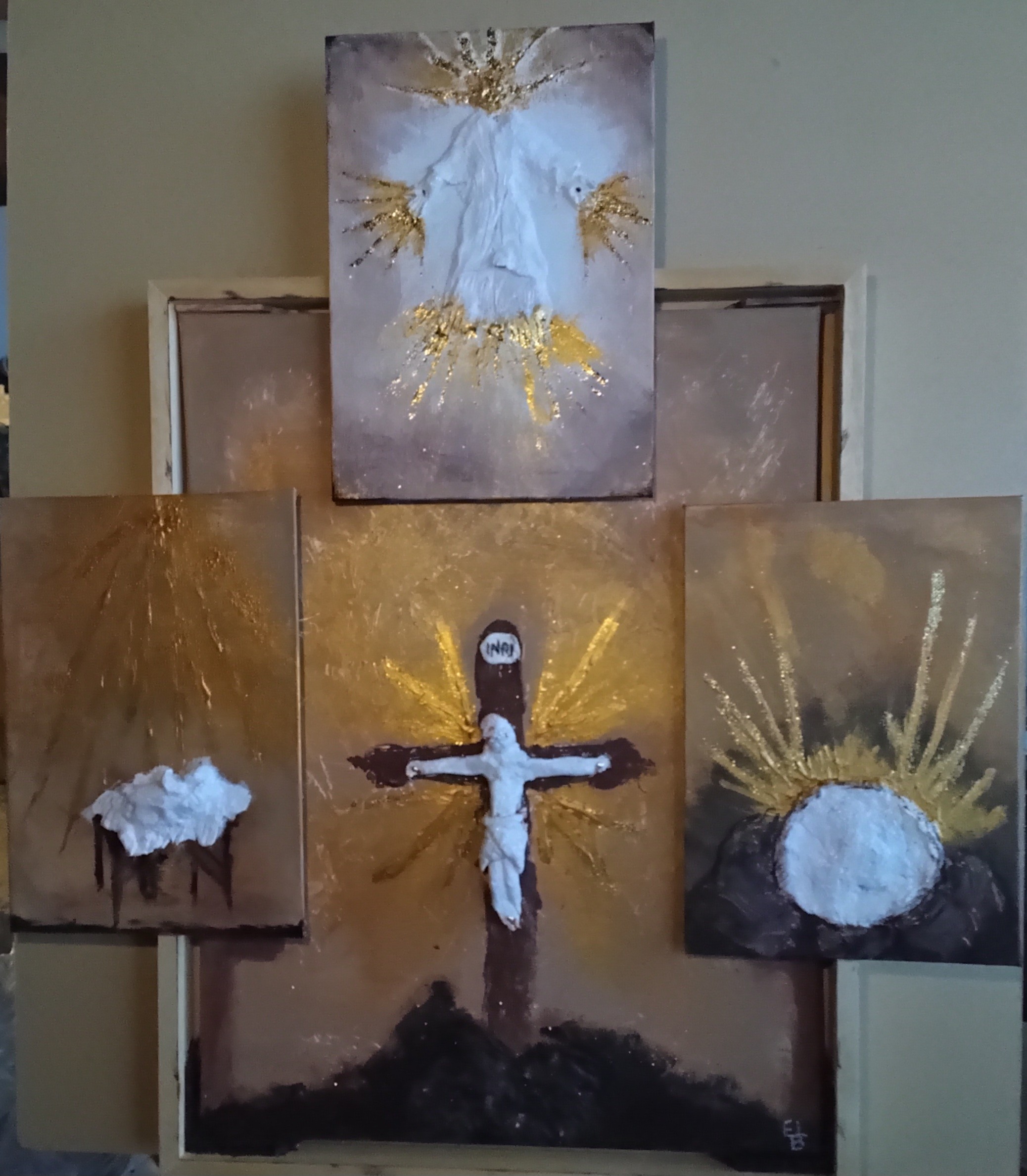 Ik begon met een idee van een Kerstafbeelding, en bereidde 1 groot en 2 kleine doeken voor. Al doende kwam het idee om er een geheel van te maken. De Kribbe, het Kruis en de Steen. Het bleef kriebelen en dus een 4e paneel eraan toegevoegd Christus in de Hemel. Het is volbracht.