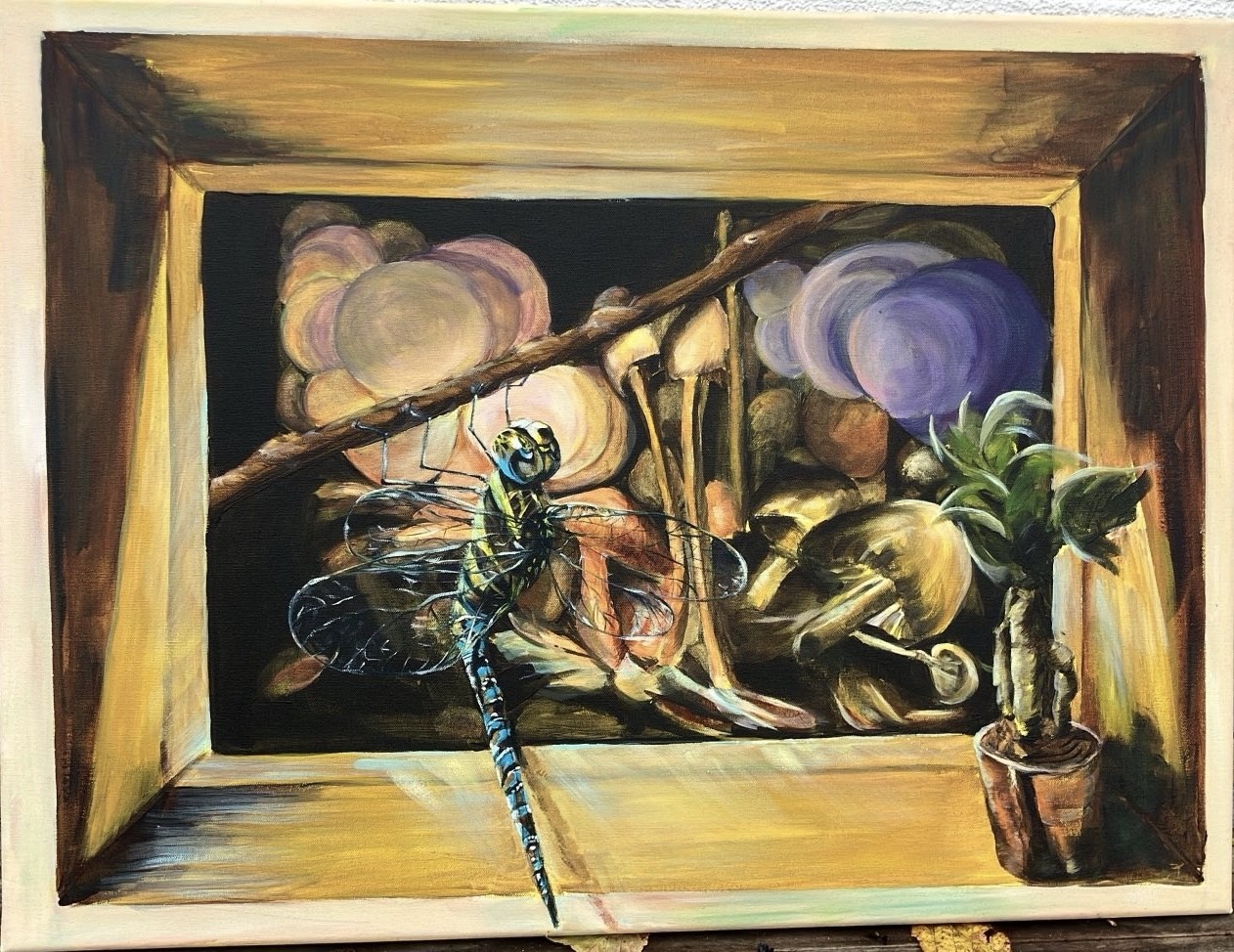 Voorverkennend tekenen, vervolgens een kijkdoos en collage maken en daarna het schilderij benaderen als een klassiek venster op de werkelijkheid. Daarna een spanningsveld creëren door (abstracte) vormen en kleuren te combineren. Zo ontstaat een nieuw beeld dat balanceert tussen herinneringen, realiteit en surrealisme. Toch staan hier de natuur en bewoners van het Roegwold in het najaar centraal met mijn eigen geregisseerd beeld.