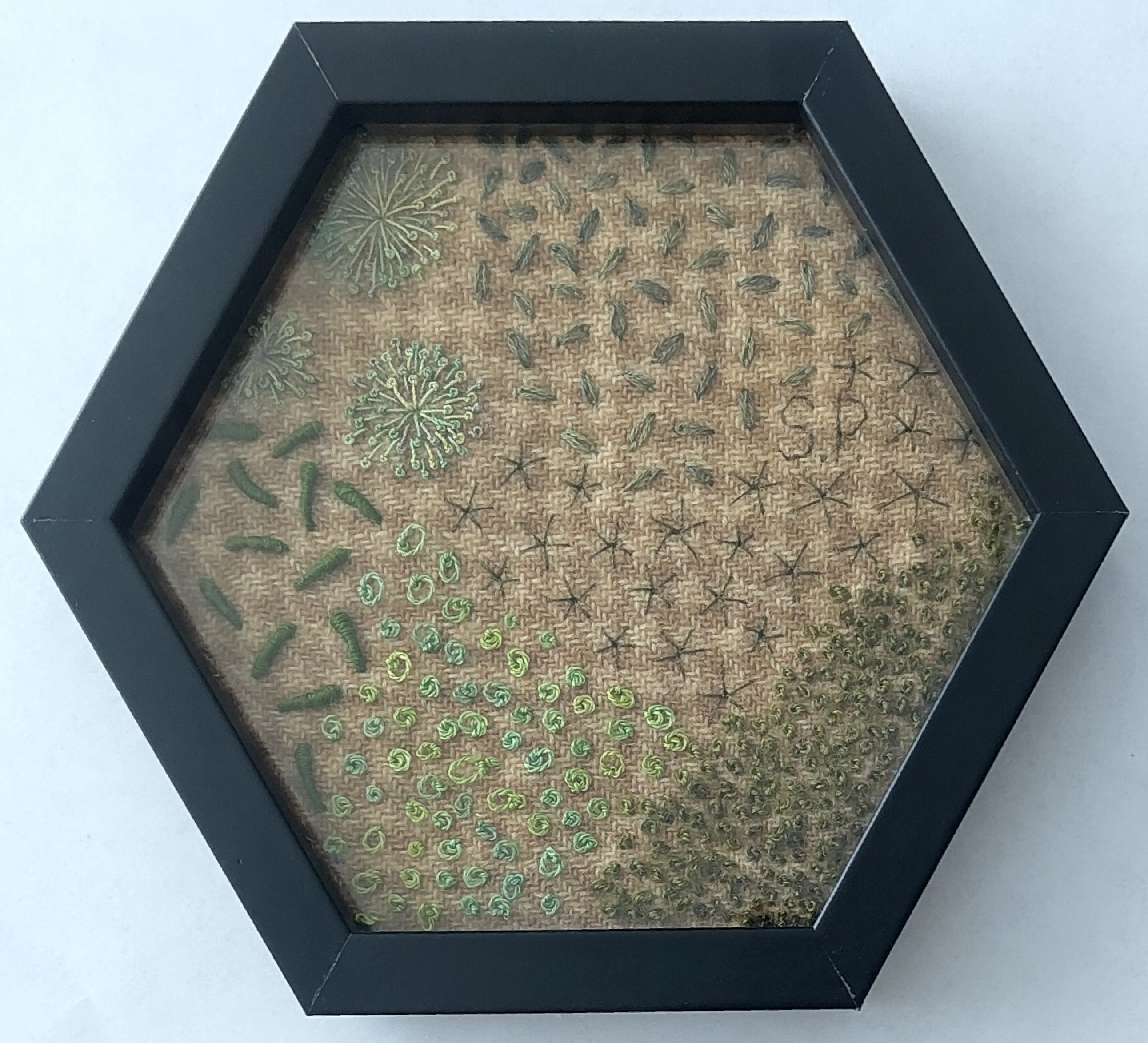 Ik vind zeshoeken een interessante vorm, waarbij composities net even anders uitkomen dan bij vierkante of rechthoekige werken. In dit werk speel ik met een voor mij bekend onderwerp, gestileerde mossen en andere planten, in deze minder vaak voorkomende vorm van de zeshoek. Hierbij moest ik dus met de compositie rekening houden met het afwijkende aantal randen en hoeken, die ook nog eens 120 graden zijn in plaats van 90. De achtergrondstof heeft een duidelijk raster, met wel die hoeken van 90 graden. Een vierkant of rechthoekig werk had het effect van dit raster versterkt, en het contrast tussen de organische planten en gestructureerde achtergrond uit balans kunnen trekken. De schuine randen van de hexagon vermijden dit probleem en brengen het organische en het gestructureerde in evenwicht. Wollen, katoenen, zijden en linnen borduurgarens op wollen tweed. De opgegeven maten zijn inclusief lijst.