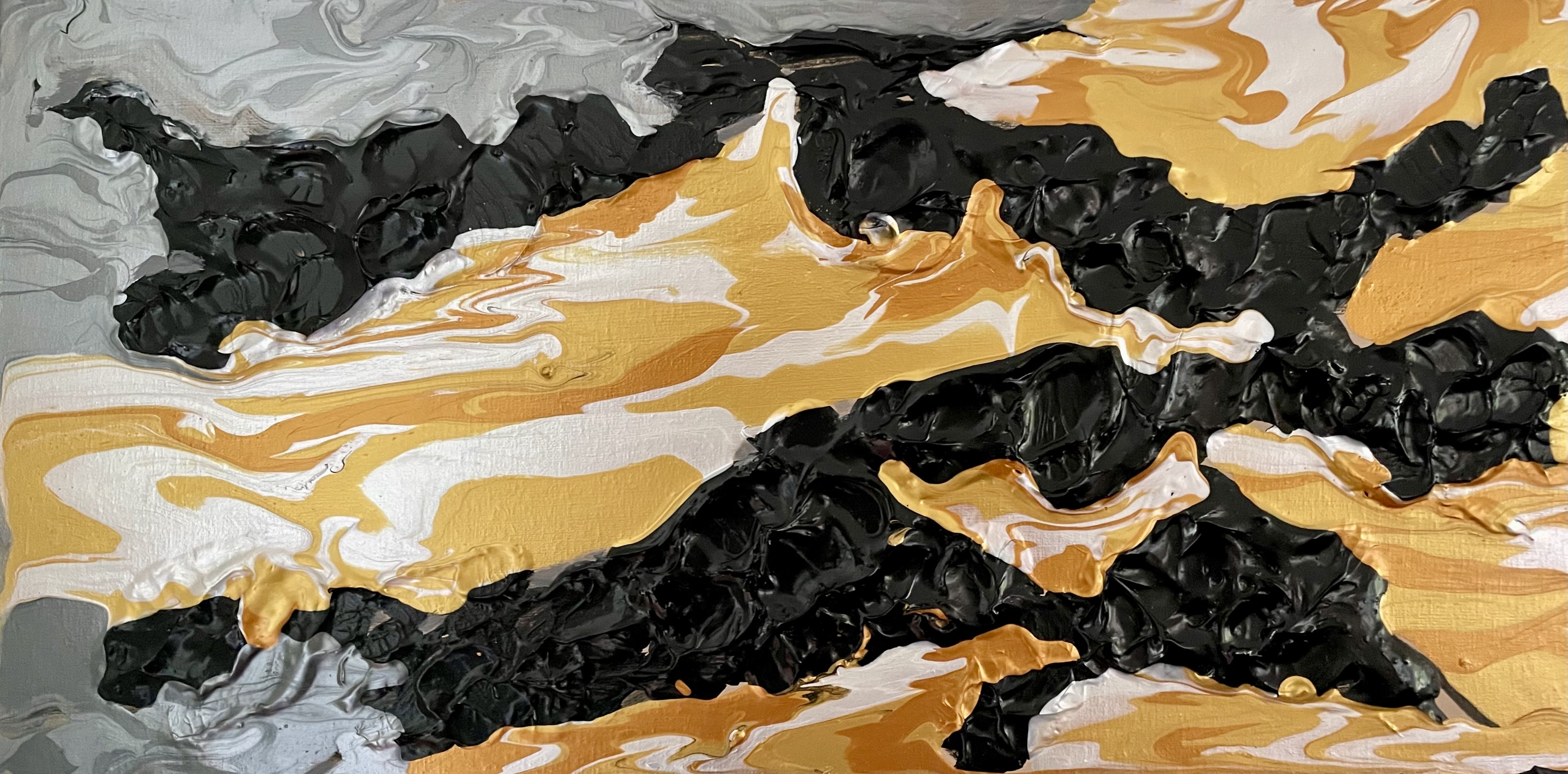 Een landschap zonder herkenbare vorm en kleur. Ruimte voor eigen verbeelding. Zwarte pasteuze delen worden afgewisseld met 'vloeiende' lijnen en vlakken