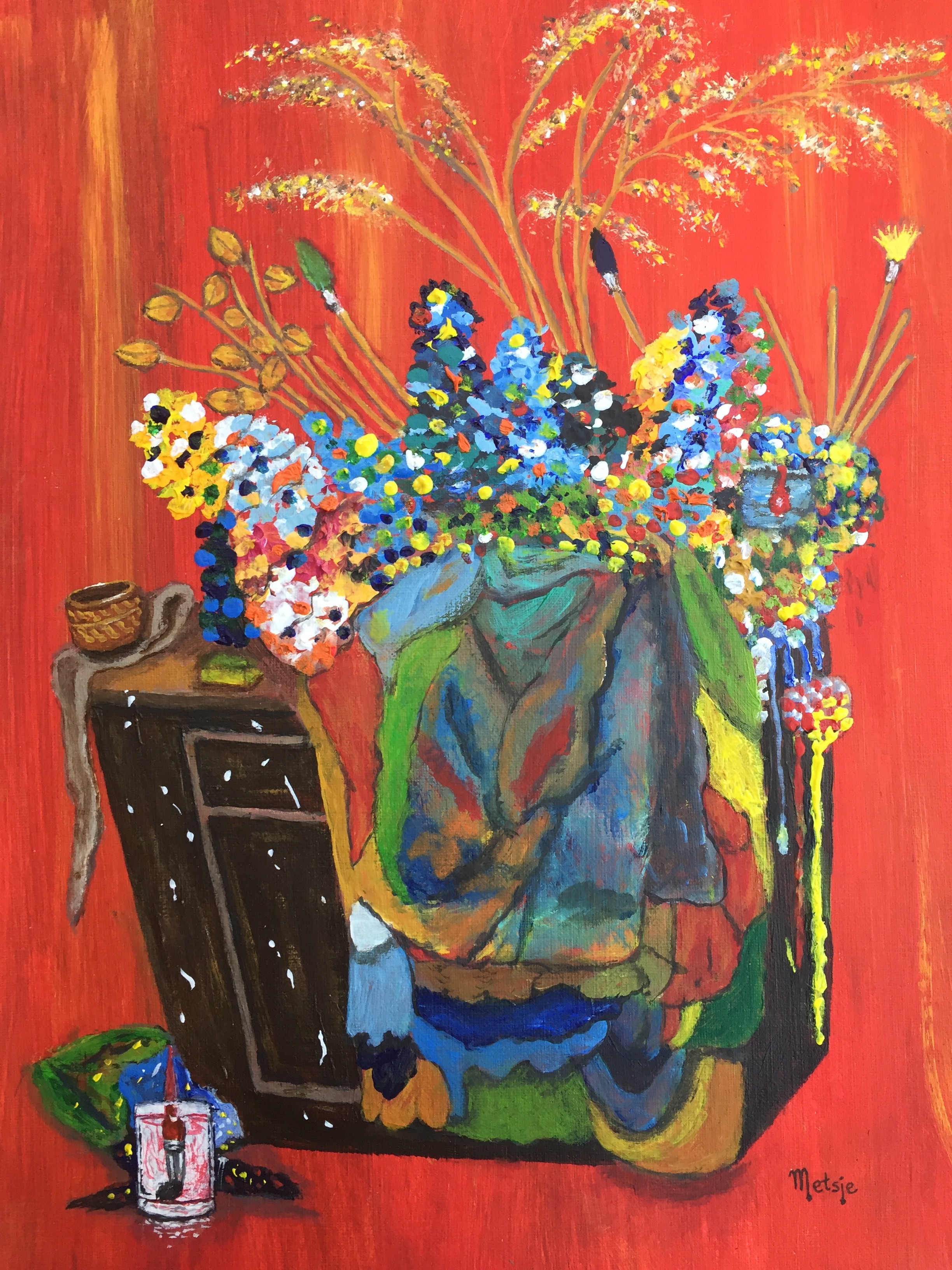 Ik was eens bij iemand in het atelier en deze persoon had jaren lang zijn overgehouden verfresten opgespaard en steeds afgesmeerd op een schotel zodat de verfbulten steeds hoger en hoger werden. Ook spaarde hij de oude gebruikte doeken op. Hier en daar steken oude kwasten uit de oude verf. Ik vond het zo bijzonder en heb mijn schilderij hierop gebaseerd.