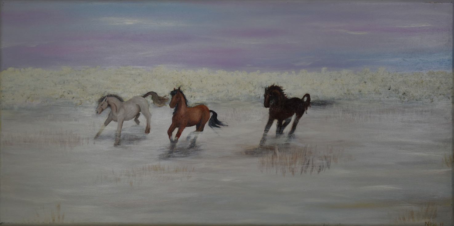 Mist landschap met galopperende paarden
