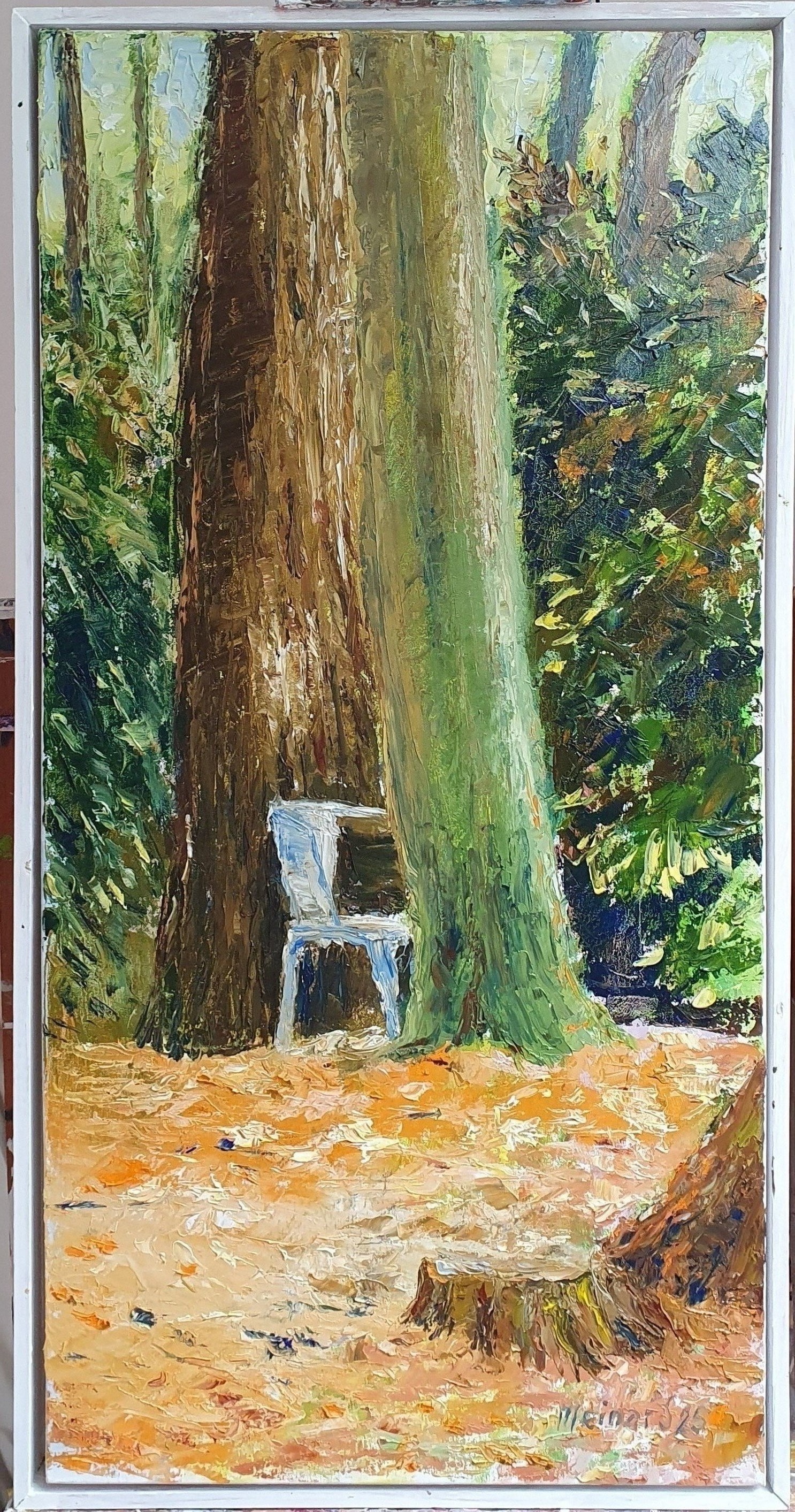 Twee hoge bomen met een witte stoel ertussen op een herfstig bladerdek met paletmes gemaakt