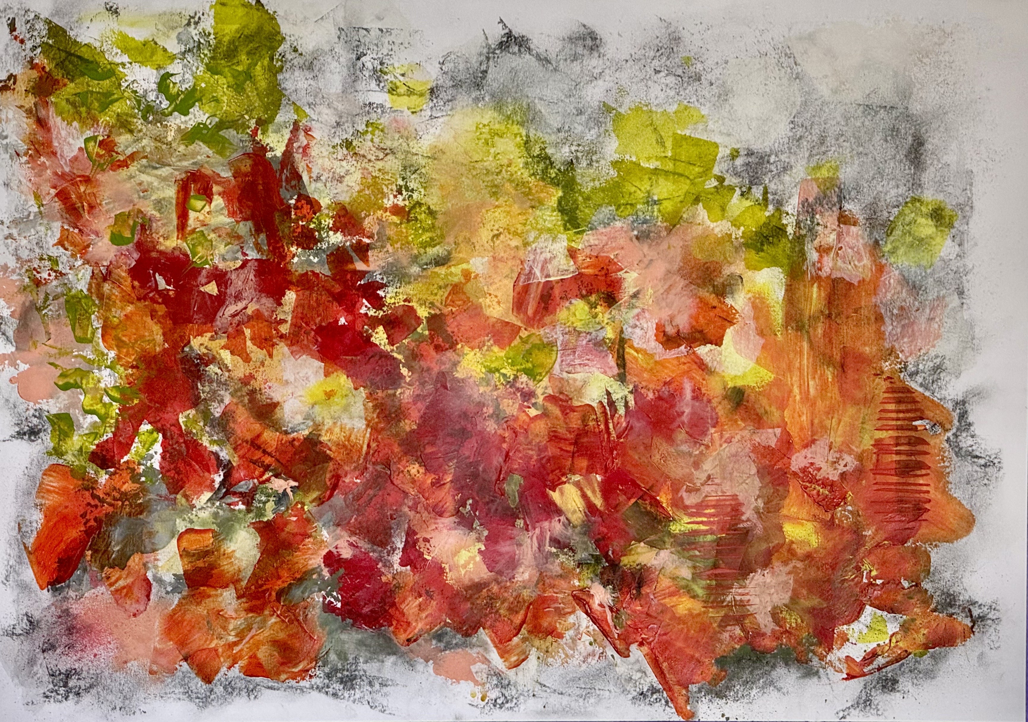 Een bonte verzameling van rood/oranje, verwilderde bloemen. Zonlicht speelt op en door de bloemblaadjes. Acrylverf, houtskool, inkt, pastel op papier.