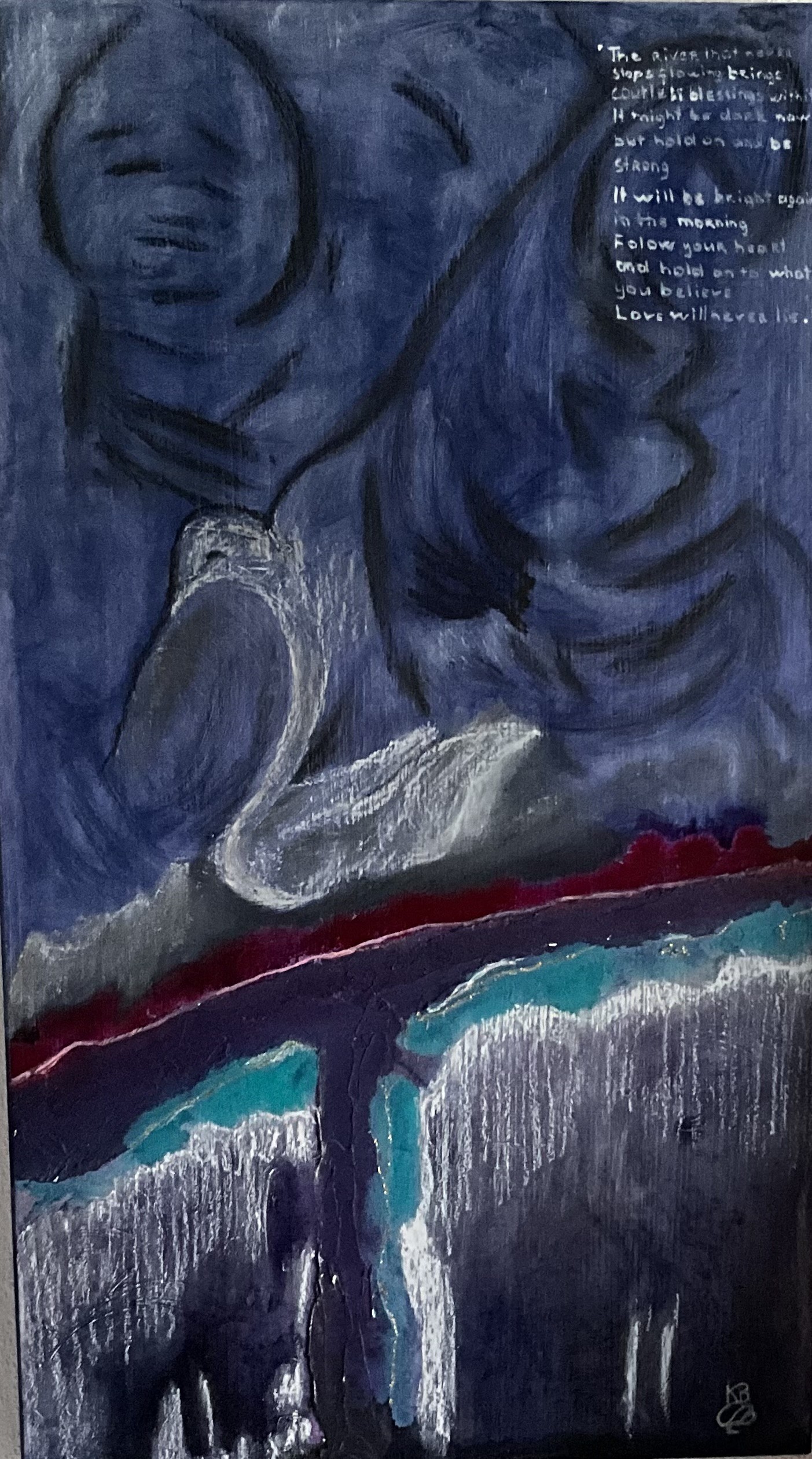Mixed media,mixed technique and mixed vision on wood. This painting is a methaphor. It’s about a break or loss, you know that feeling.And after a long period,the light begins to shine again at the end of the tunnel.