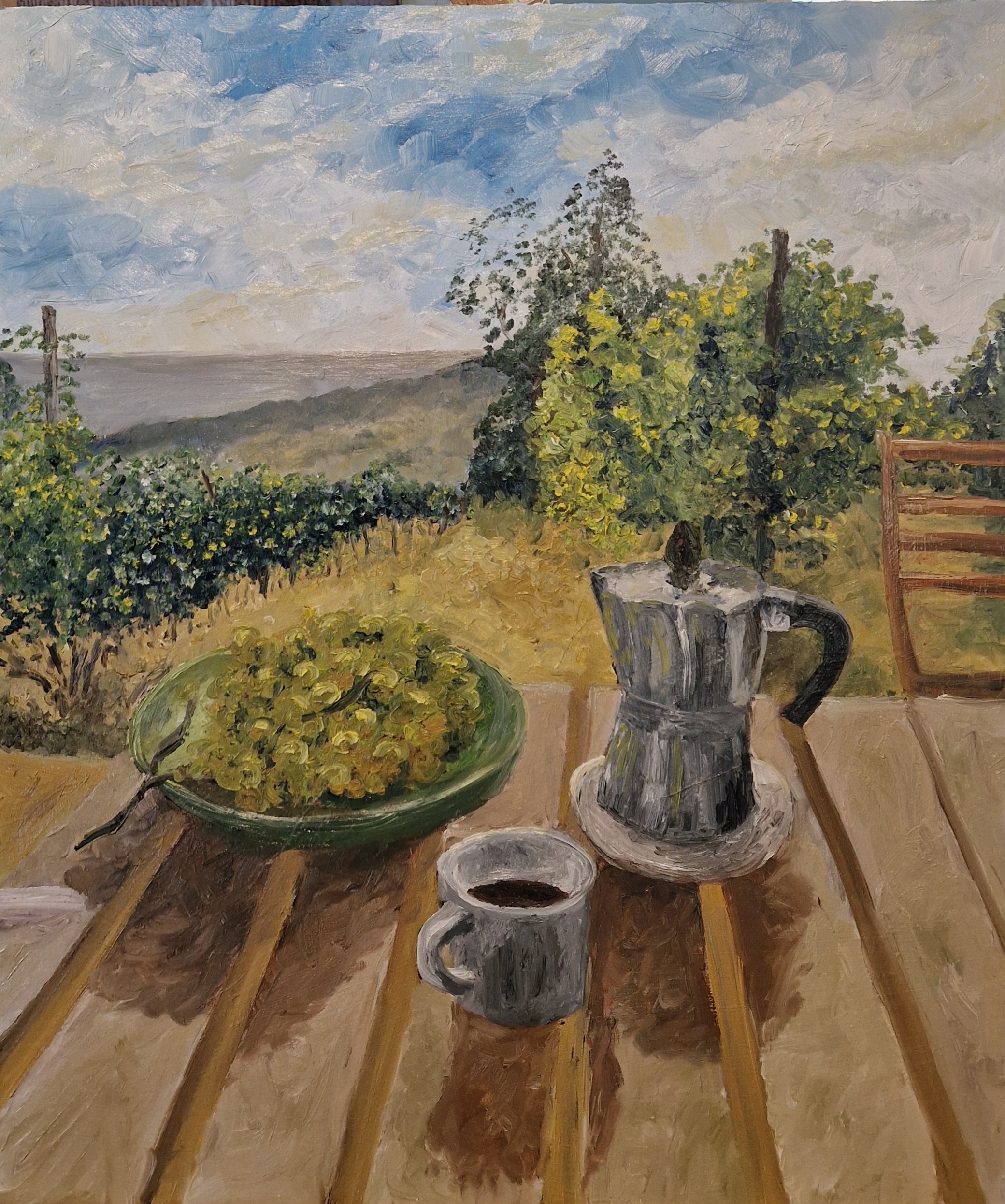 In dit werk, Italian Grapes and Coffee, wil ik de eenvoudige schoonheid van het Italiaanse platteland vastleggen. Geïnspireerd door de rust en de rijke tradities van het landschap in Campanië, brengt dit schilderij een moment van stilte en reflectie in beeld. De druiven, vers geoogst en glanzend in het ochtendlicht, symboliseren de overvloed en de harde arbeid van de lokale boeren. De koffiepot en het kopje vertegenwoordigen de dagelijkse rituelen die ons verbinden met de aarde en met elkaar. Het uitzicht over de heuvels en de wijngaarden tot aan de Tyrreense Zee nodigt de kijker uit om even te ontsnappen aan de drukte van het moderne leven en te genieten van de tijdloze charmes van het platteland. Met dikke, expressieve penseelstreken en een warme kleurenpalet probeer ik de textuur en de sfeer van dit bijzondere landschap over te brengen. Het is een ode aan de eenvoud, de traditie en de schoonheid die we vaak over het hoofd zien in ons dagelijks bestaan.