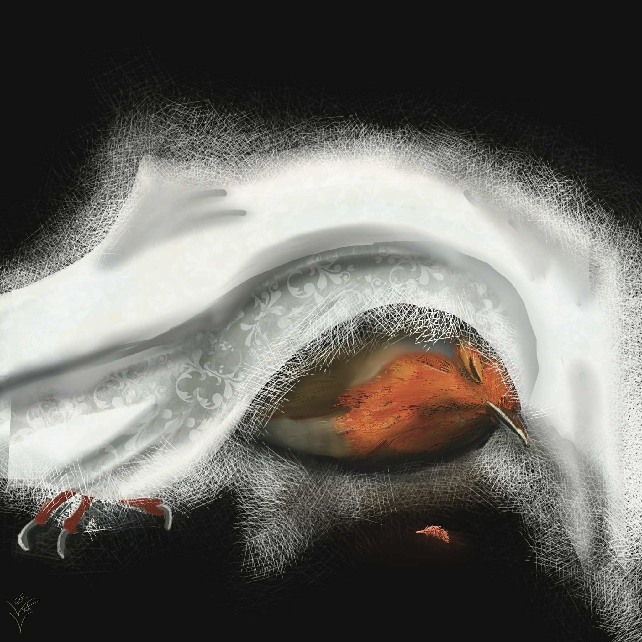 In de linnendoek ligt ze daar met haar herkenbare vorm het ronde bolletje van het roodborstje maar helaas zal ze nooit meer vliegen. Digitale tekening. Vorm alles heeft vorm zelf als je dood bent is er nog vorm dat langzaam vergaat. Dit is de vorm die ik instuur voor de wedstrijd vorm