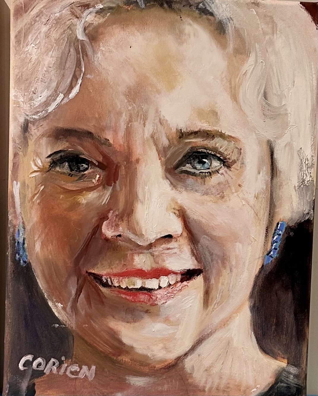 Jeanette, zoals ze is in de bijna 50 jaar die ik haar ken” sprankelend, altijd vrolijk, haar “glas is altijd halfvol, nooit halfleeg”. Geschilderd in pasteuze olieverf