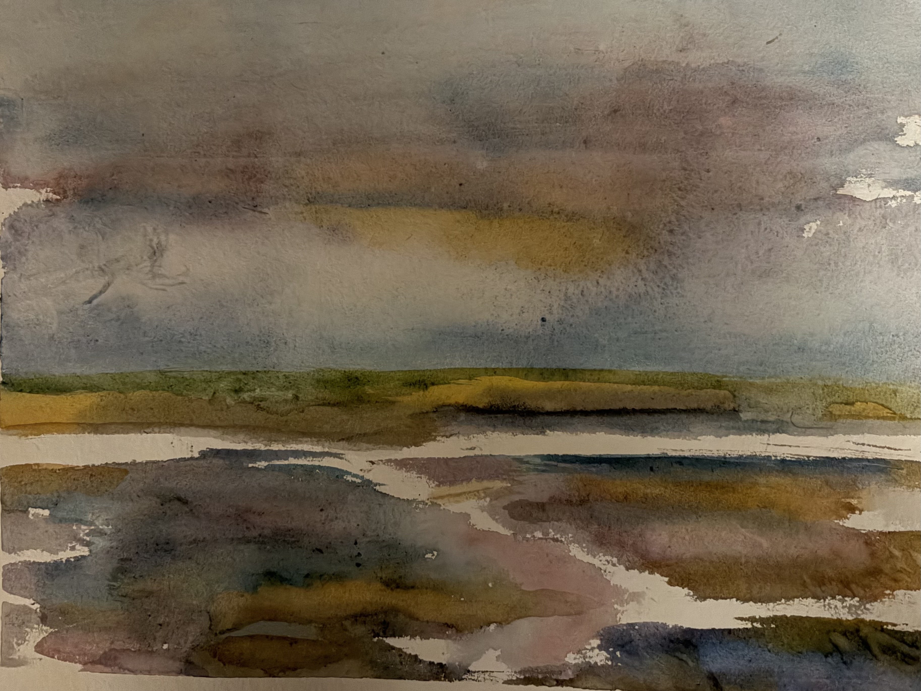 Dior oogharen een kleurschouw spel op het rroogvallende wad Terschelling tegen de avondschemering aan waarbij doorsluimerrnd licht gold van de ondergaande zon . Vrij werk met grote kwart streken .