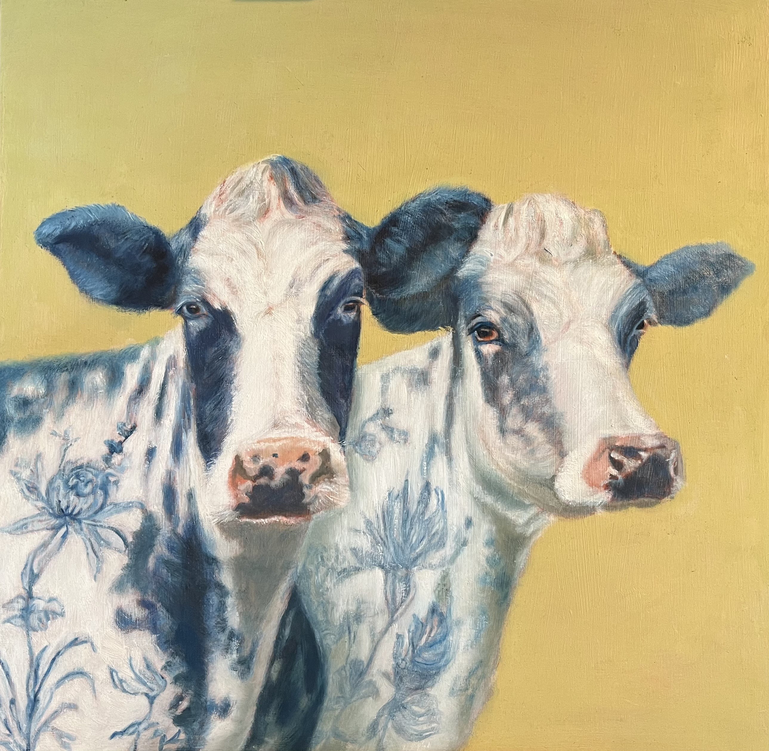 Een koe associeer ik vooral met Nederland en omdat idee nog te versterken heb ik ze in Delftsblauw geschilderd.