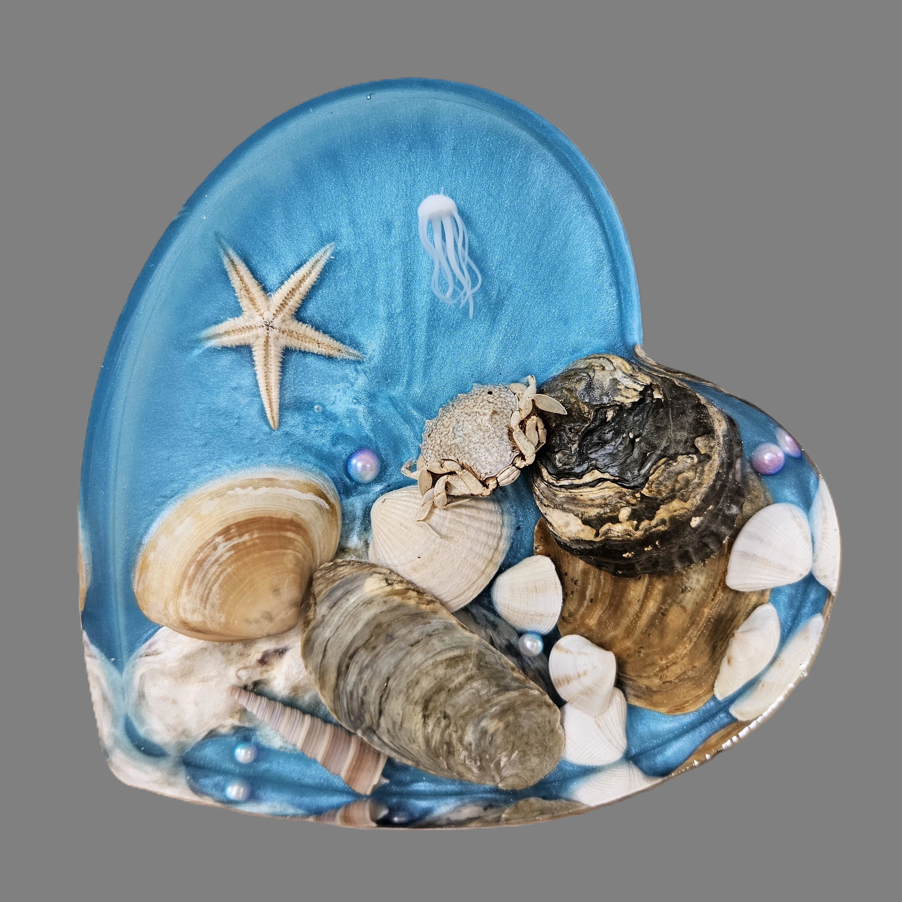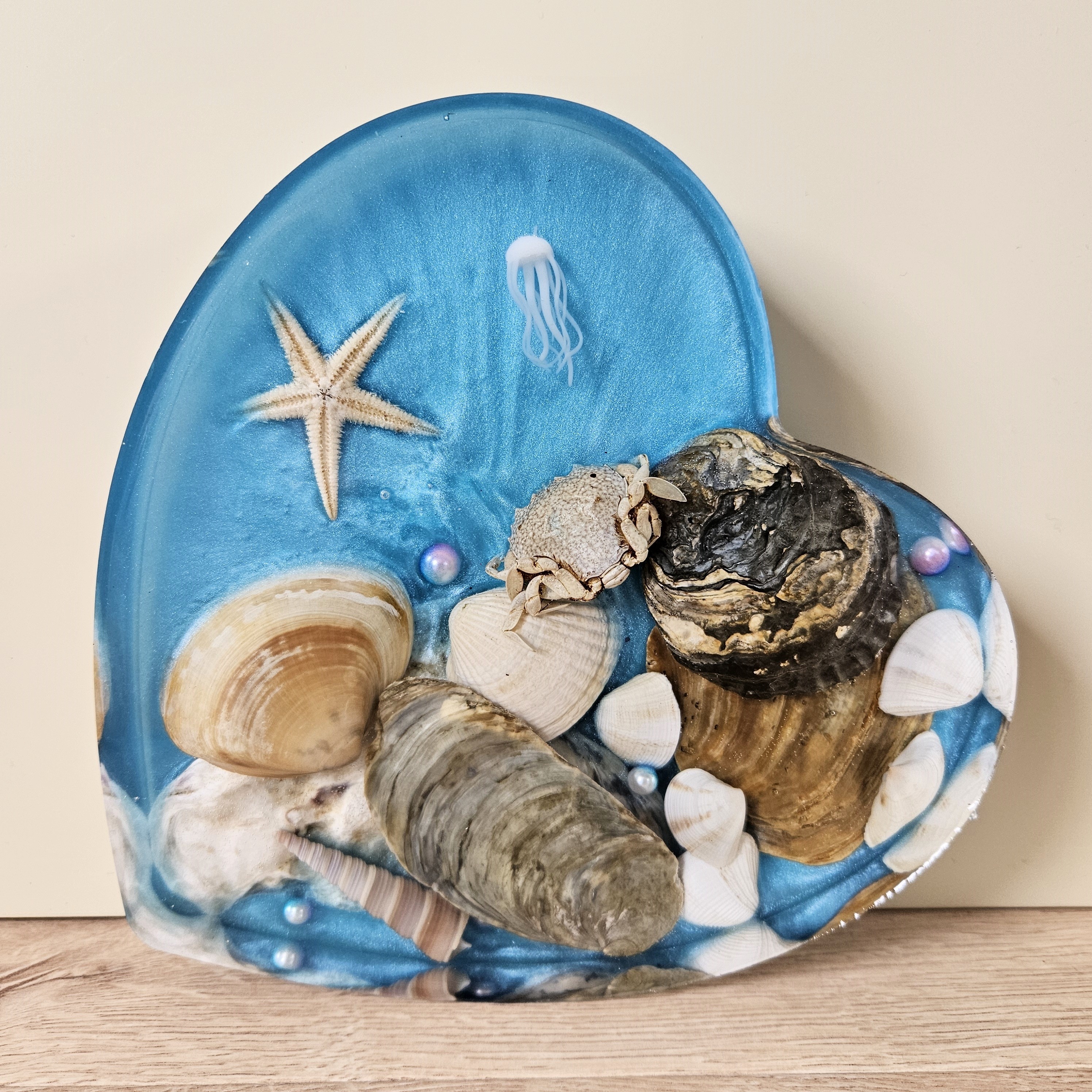 Hart is gegoten met epoxy en ingelegd met schelpen en krabbetje uit de Noordzee. Altijd de zee in de buurt.