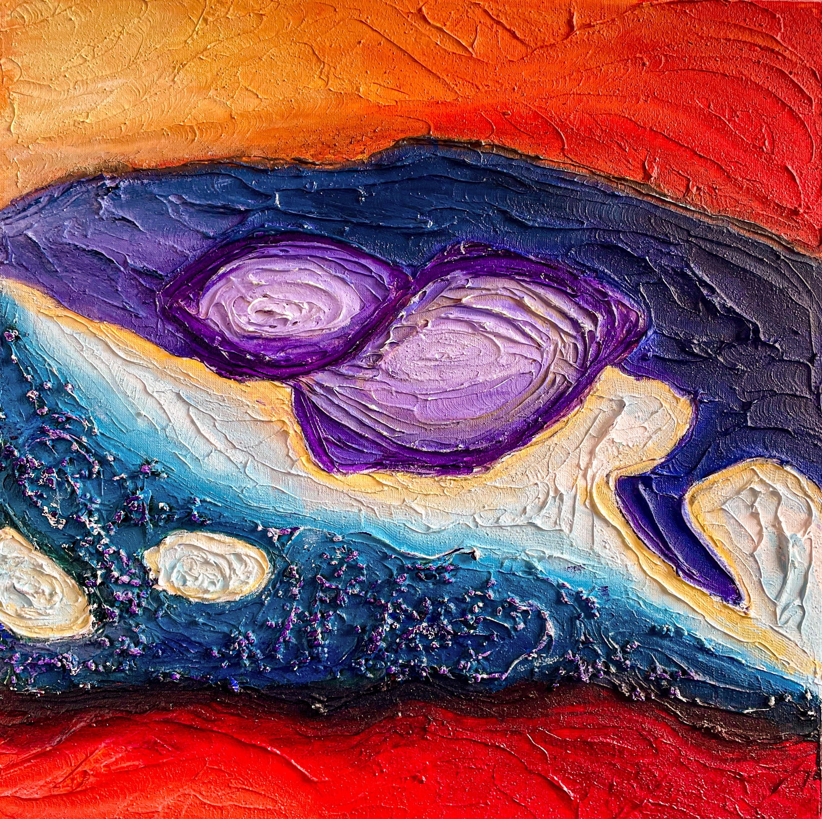 In dit abstracte landschap vloeien kleur en textuur samen tot een gelaagde compositie. Warme en koele tinten ontmoeten elkaar in een spanningsveld van beweging en stilte. Het werk verbeeldt geen plek, maar een innerlijk landschap waarin emotie en ritme centraal staan Een mooie baklijst is inbegrepen.