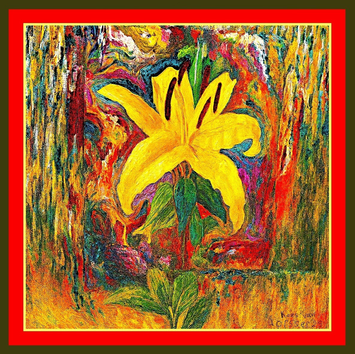 De lelie staat fel en zonnig tegen een levendige achtergrond vol kleur en beweging, waarbij haar helderheid contrasteert met de kolkende abstractie eromheen. De penseelstreken suggereren een mengeling van natuurkrachten en expressie.