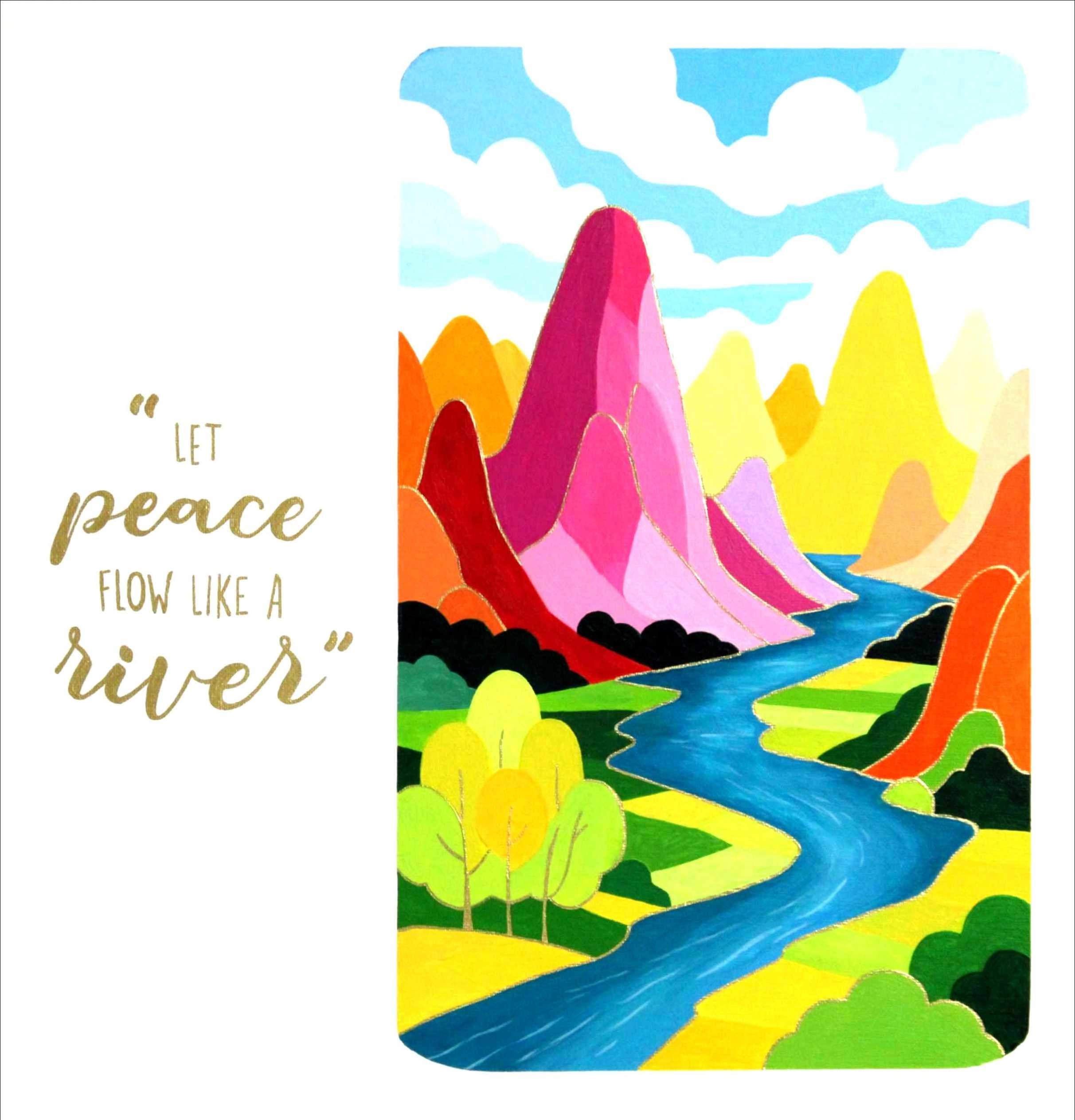 Dit is mijn eerste schilderij waarin ik tekst met beeld combineer. De tekst ‘Let peace flow like a river’ past bij dit kleurrijke schilderij waarin een rivier te zien is die slingert door een landschap van felle tinten. De witte lijnen in het water benadrukken de rivier, zodat die echt in beweging lijkt. Sommige vlakken heb ik subtiel geaccentueerd met gouden omlijningen om de samenhang tussen tekst en beeld te benadrukken en om een soort luxere uitstraling te krijgen.