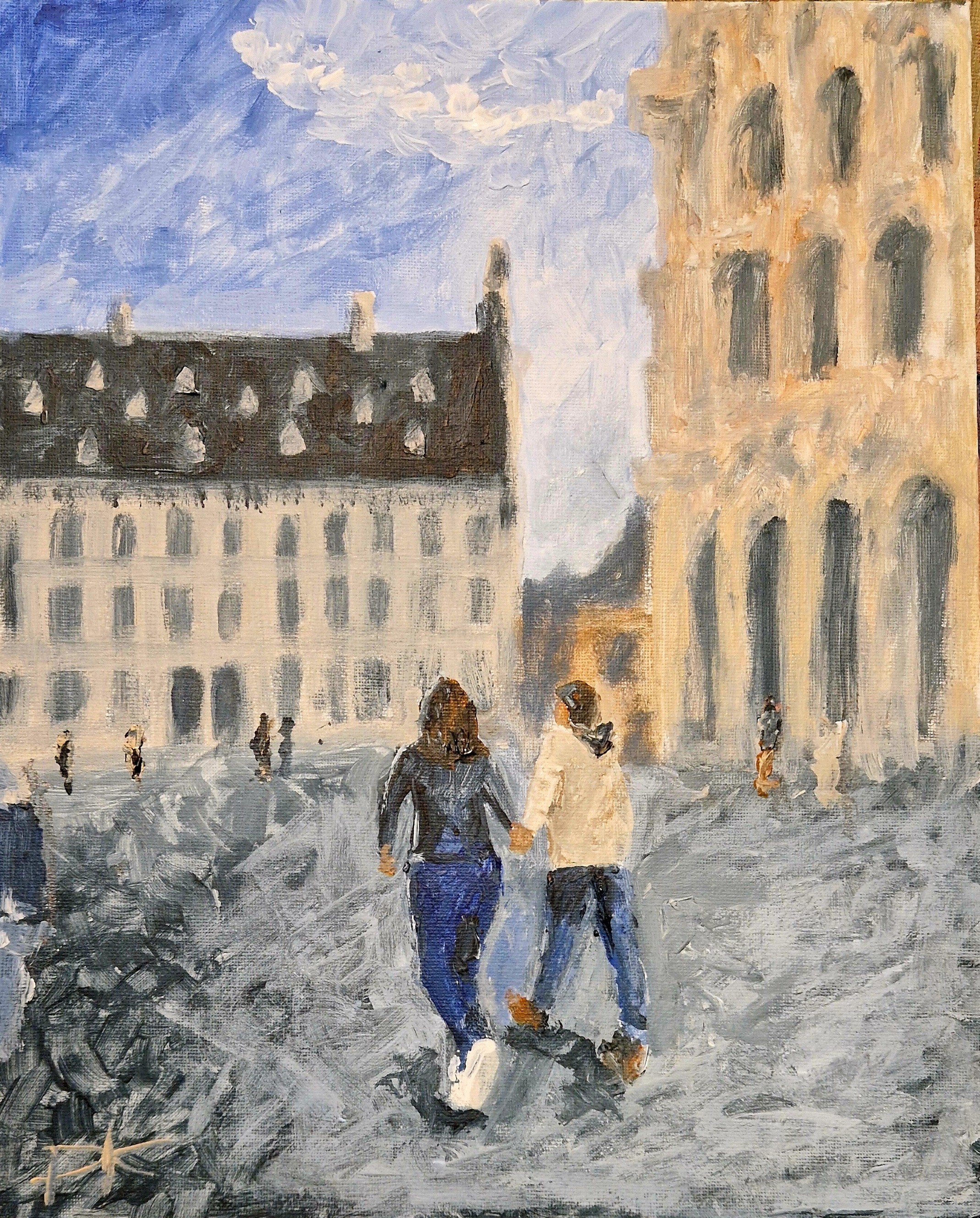 Deze keer wilde ik het najaar in Leuven vangen—dat vluchtige moment waarop de lucht koel wordt, maar de stad nog warm ademt. De twee figuren in het midden, hun handen losjes ineengestrengeld, wandelen door een Leuven dat zich langzaam kleedt in herfsttinten. Zachte, goudkleurige licht dat alles omhult, alsof de tijd even vertraagt. De gebouwen, met hun statige gevels en hoge ramen, staan als stille getuigen. Ze hebben zoveel seizoenen gezien, maar het najaar geeft ze iets extra’s: een melancholieke schoonheid, een herinnering aan de zomer die was en de winter die komt. Ik wilde die sfeer vastleggen—de rust, de warmte van een herfstdag, en dat gevoel van thuis zijn in een stad die nooit helemaal stilstaat.