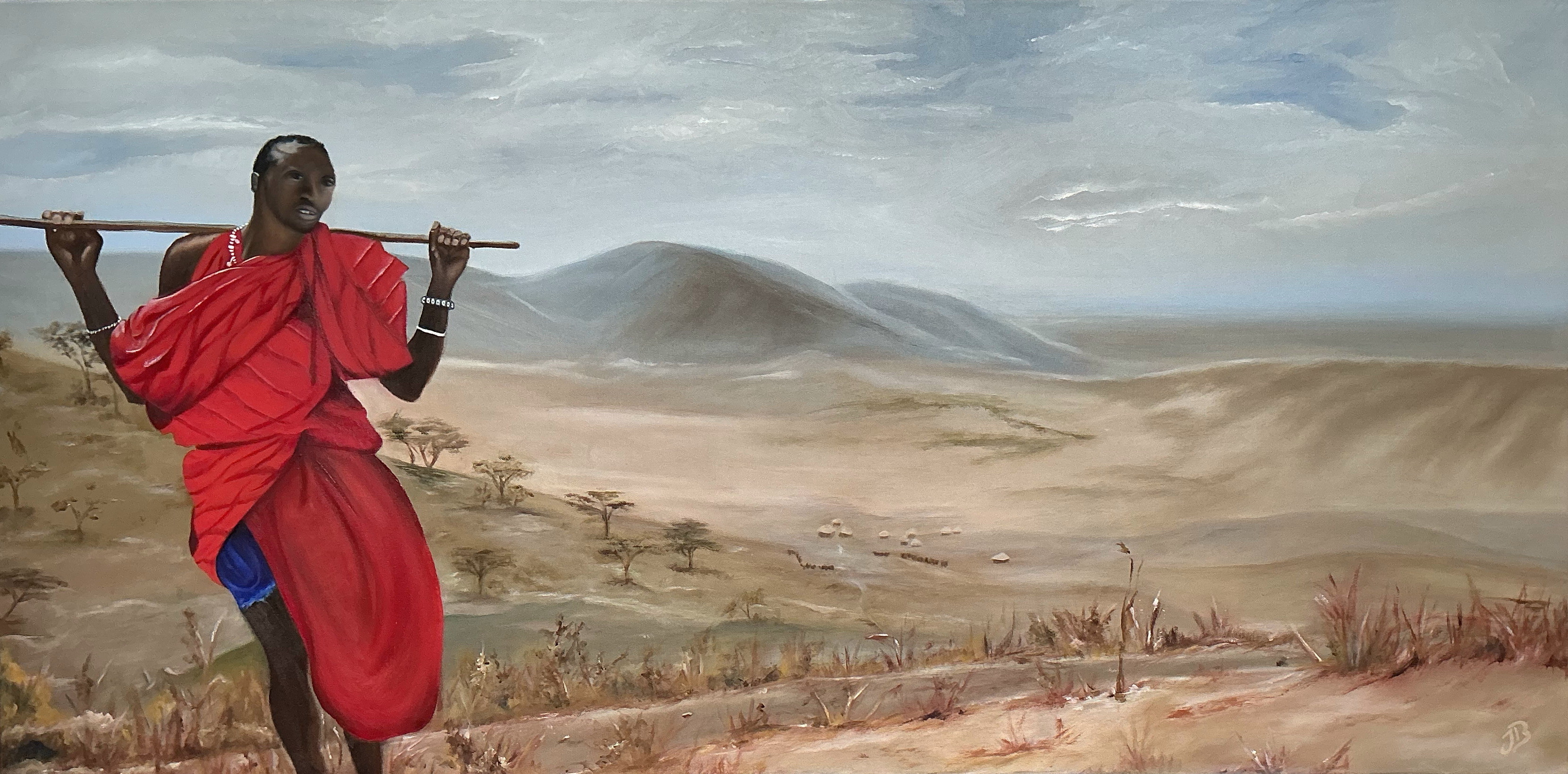 Mooie herinnering! Een fantastische reis die mij altijd bij blijft. Tijdens onze reis in Tanzania kwamen we deze Maasai-herder tegen, dit mooie moment heb ik in olieverf vastgelegd. Het is heel bijzonder hoe dit nomadenvolk leeft en steeds verder reist. De dieren, welke we in hun natuurlijke leefomgeving, in grote getale hebben mogen zien, waaronder ook de big 5 staan op mijn netvlies gebrand evenals de geur van de dieren, de natuur, en het lekkere eten.