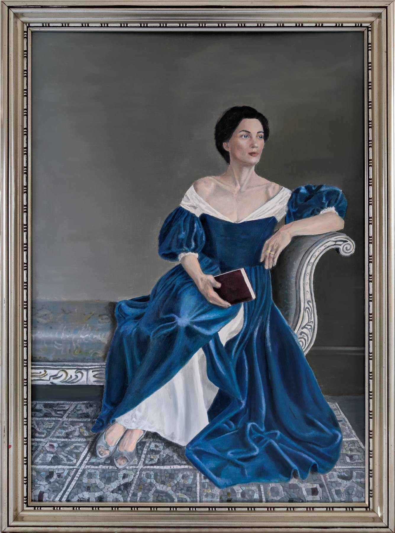 Verstild maar krachtig, zo zit deze zelfverzekerde vrouw. Er moest een moderne versie van een klassiek portret komen. Tijdens de voorbereiding kwam de voorliefde voor de portretten van Van Dijck naar voren, zijn werk is dan ook de inspiratiebron voor dit werk. Geen adidasjes, geen mantelpakje, tijdloosheid en innerlijke rust zouden de boventoon voeren in dit portret. Statig en contemplatief, stijlvol en onverstoorbaar. In haar handen houdt ze haar kostbaarste bezit: een rood dagboekje van haar moeder, volgeschreven toen ze wist dat haar tijd eindig was. Gevuld met levenslessen zolang ze die nog kon vertellen. Dit vond ik een dermate krachtig gegeven dat het zonder twijfel onderdeel moest worden van het uiteindelijke werk. Dat boekje is de meest tastbare herinnering aan haar moeder en is altijd zichtbaar in haar woonkamer. Dit schilderij zal haar moeder nog langer een onderdeel laten zijn van het verhaal van de familie.