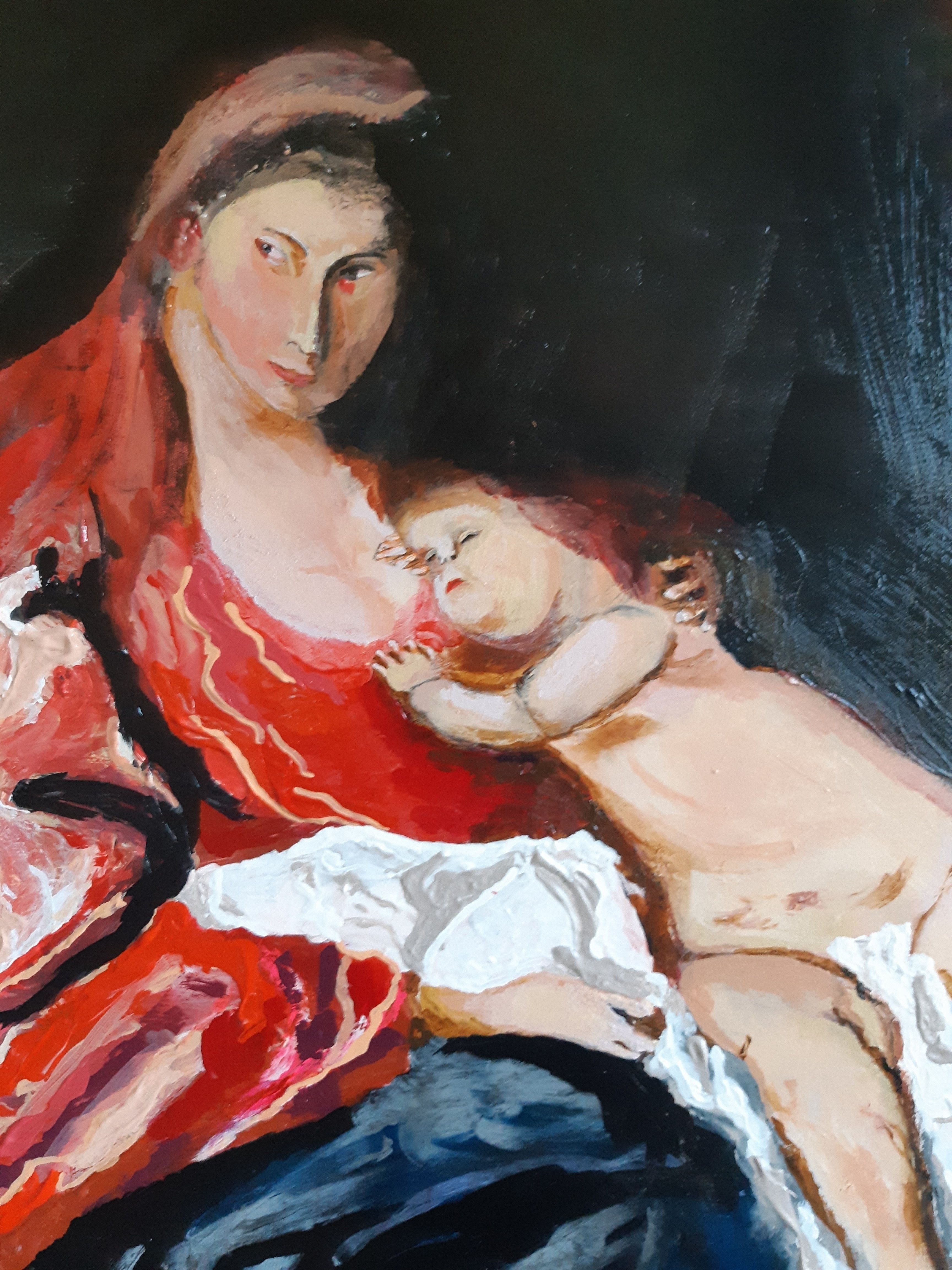 Detail van doek 'Maria met kind' en Jozef op de achtergrond.