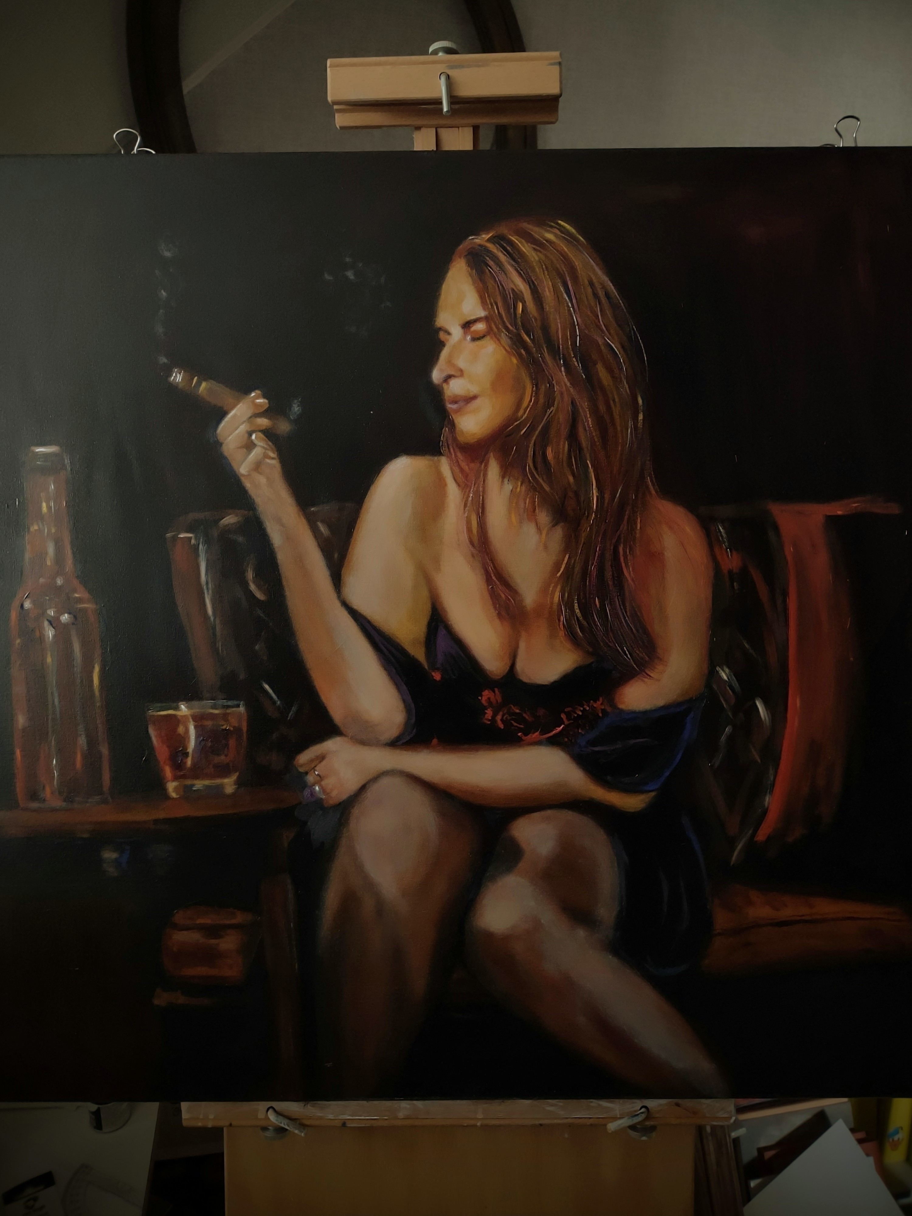 Let op de details: fles, glas, bank, sigaar, rook, handen, kleurrijk haar en natuurlijk haar gezicht.