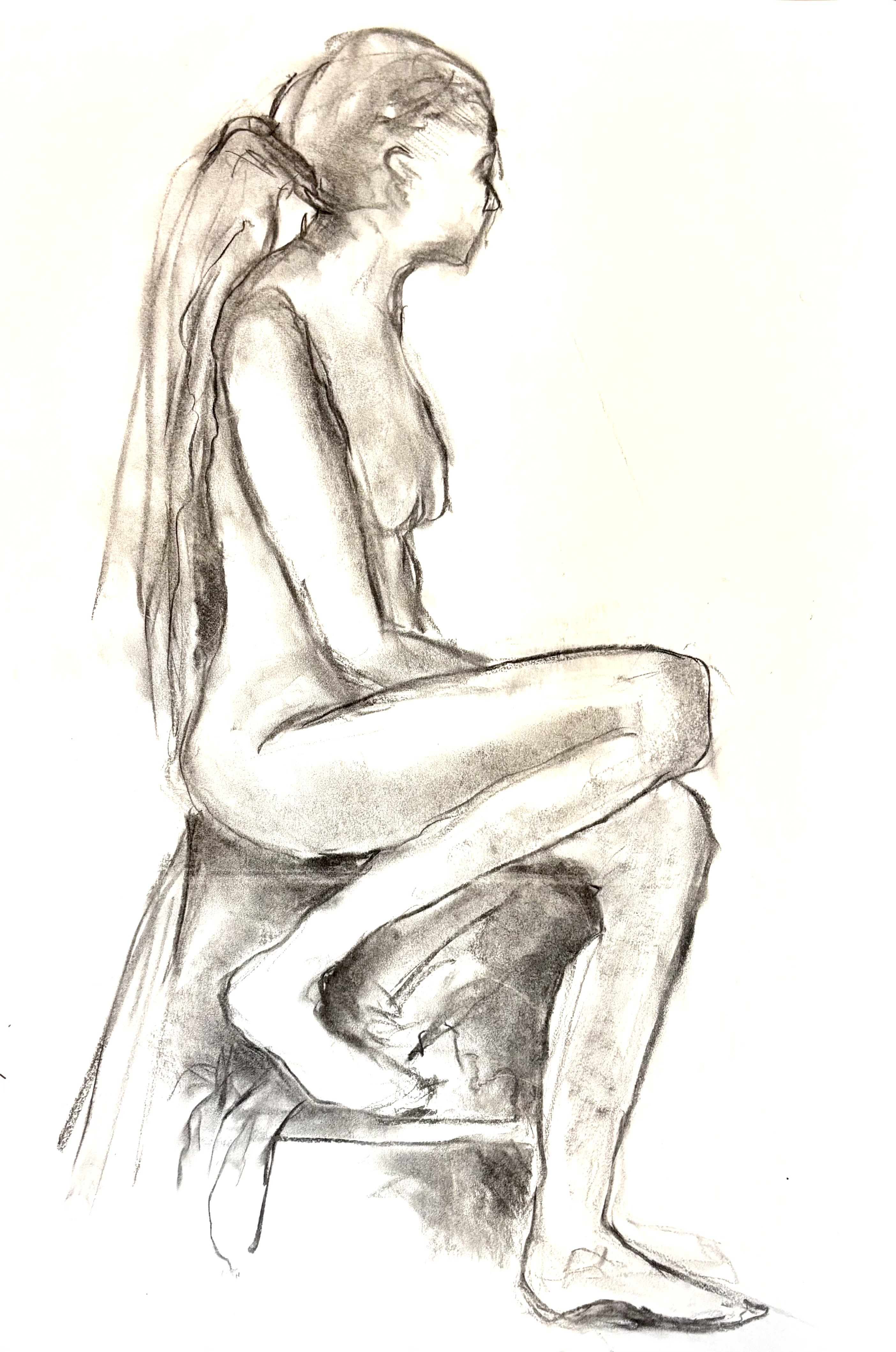 Modelstudie. Houtskool en krijt op wit tekenpapier.