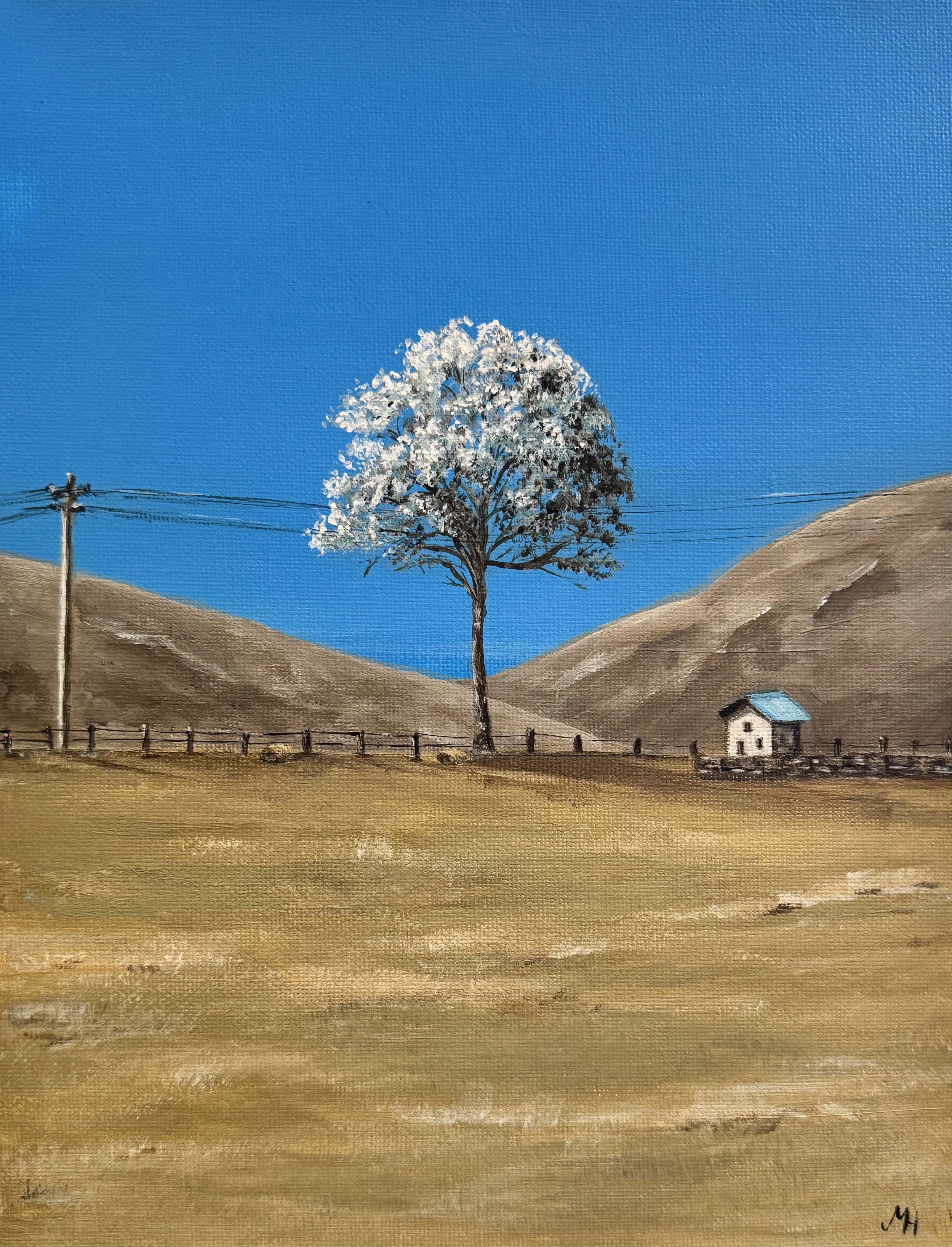 Een eenvoudig landschap met een open lucht en één boom als centraal punt.